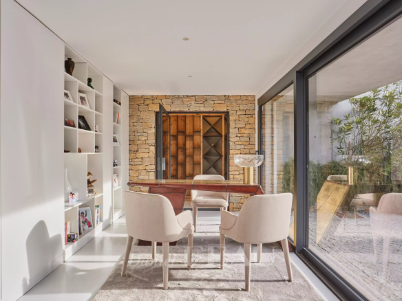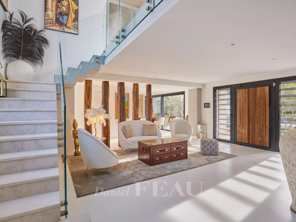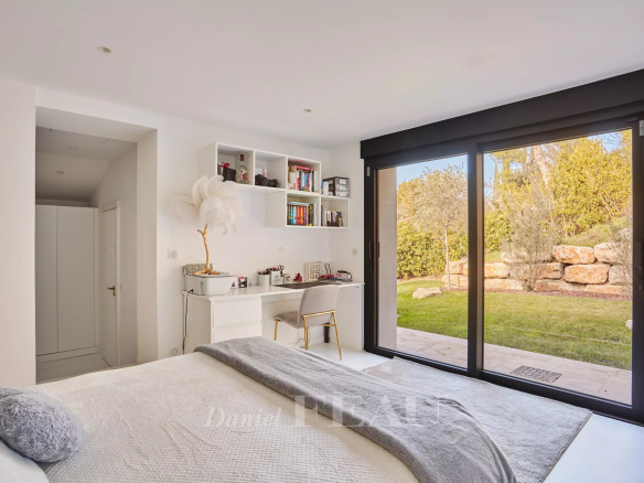 Les prestations haut de gamme incluent en rez-de-jardin une vaste entrée, un bureau, une salle de détente-sport, un sauna et une douche, trois suites avec accès au jardin et une buanderie.