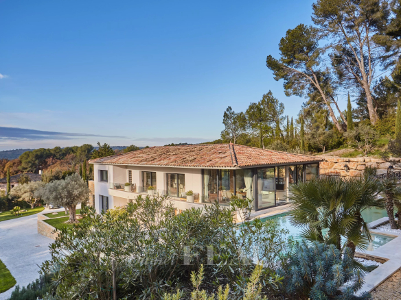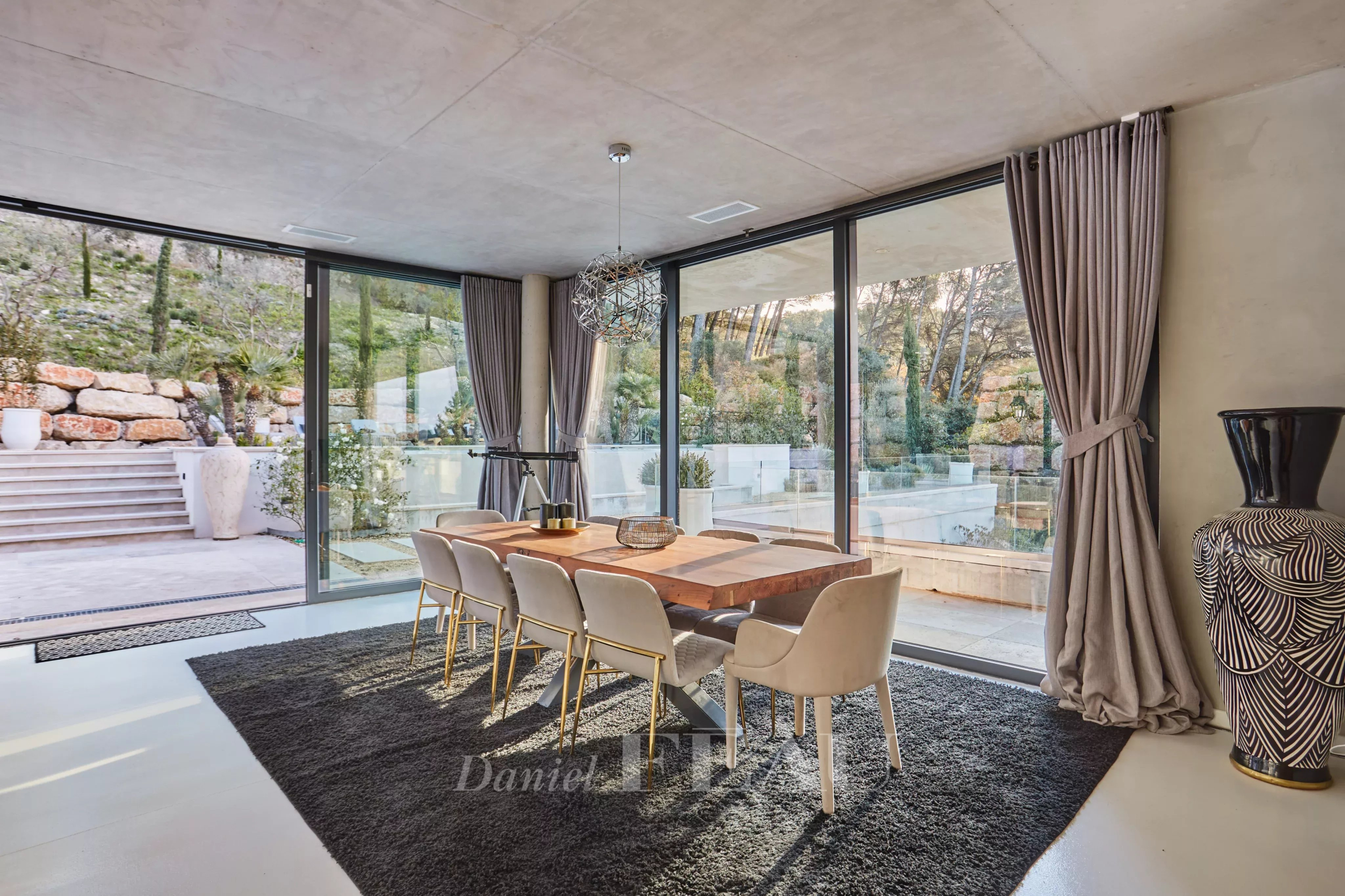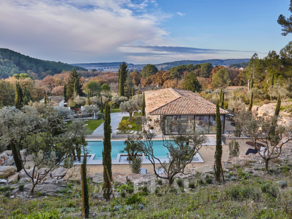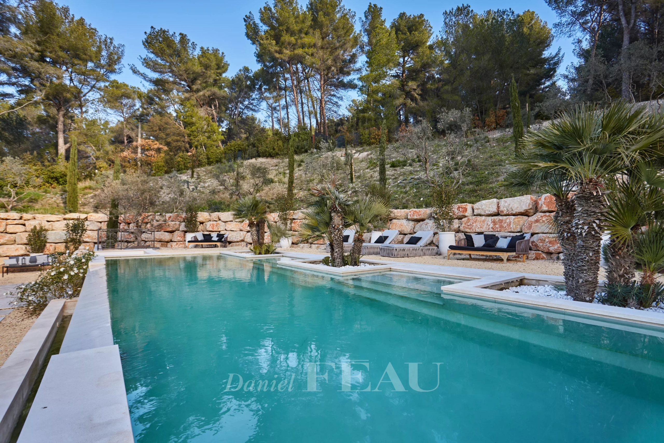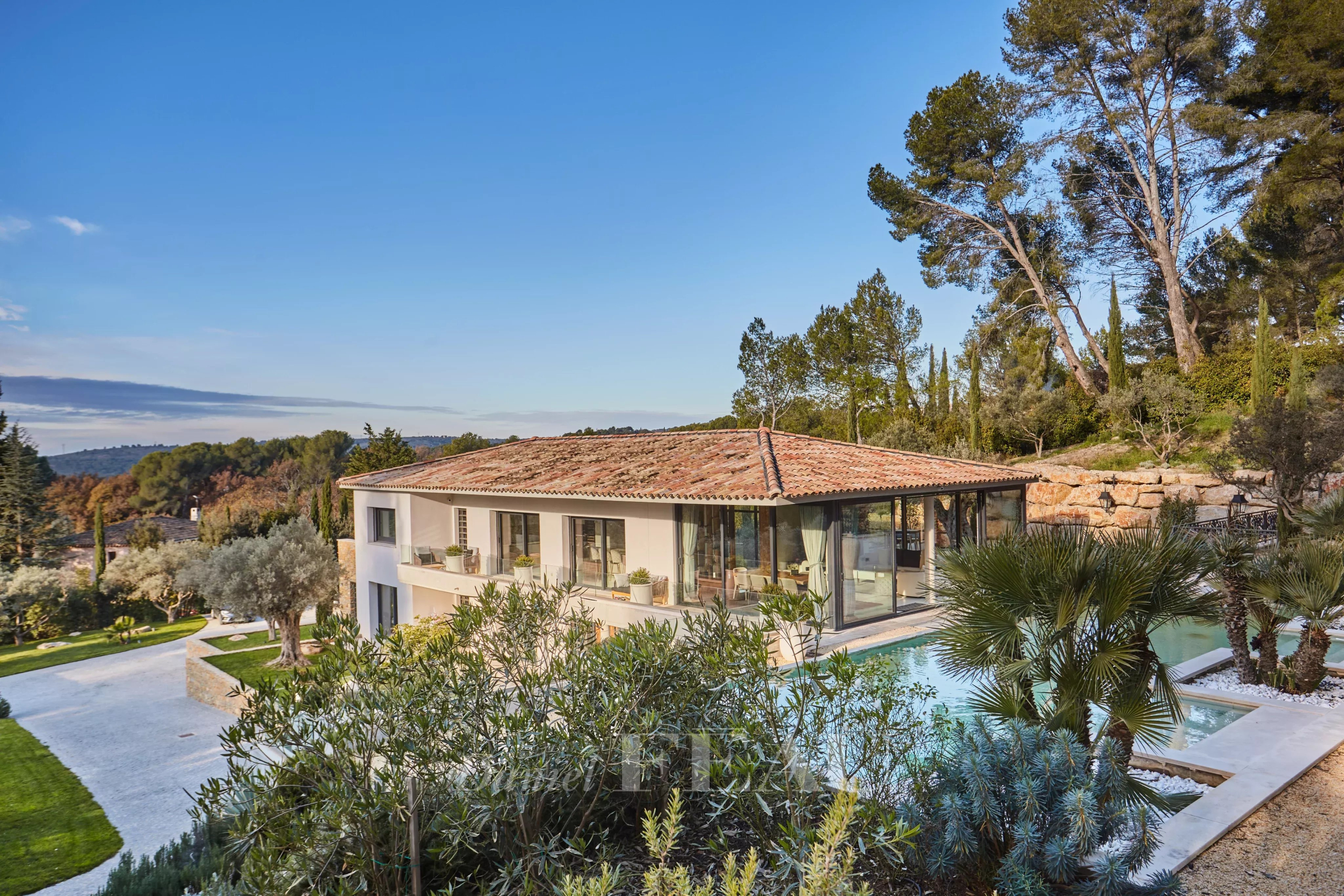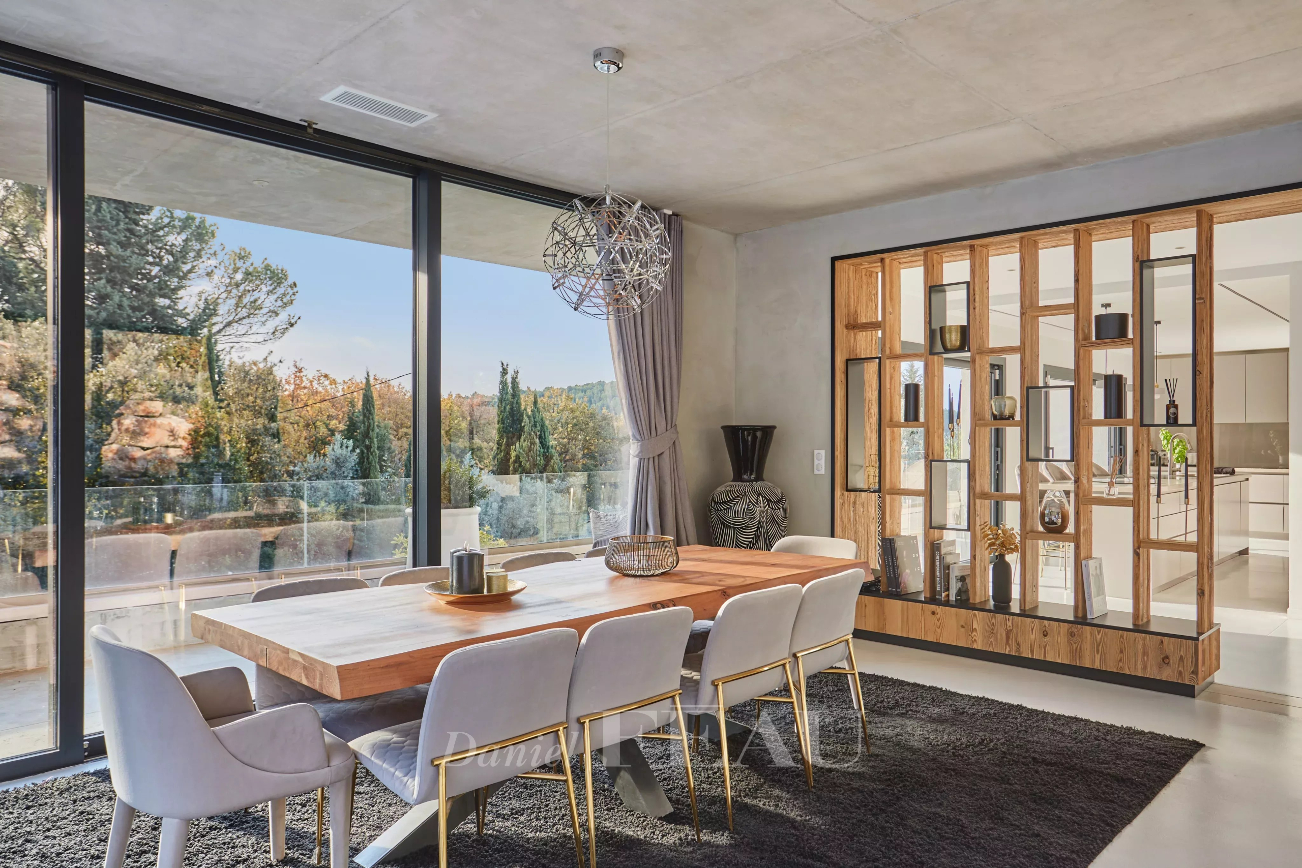 A 10 minutes d’Aix en Provence, au calme, rare propriété contemporaine nichée dans un environnement de verdure, offrant une très belle vue dégagée sur un terrain de 4070 m² paysager.