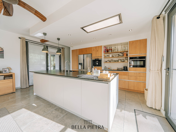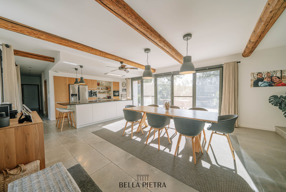 Le coeur de la maison se structure autour d’une pièce de vie de 100 m2, lumineuse, avec ouverture directe sur les terrasses et la piscine chauffée. Les volumes, la circulation et la lumière ont été pensés pour une exploitation fluide et confortable, en résidence principale comme pour un projet locatif.