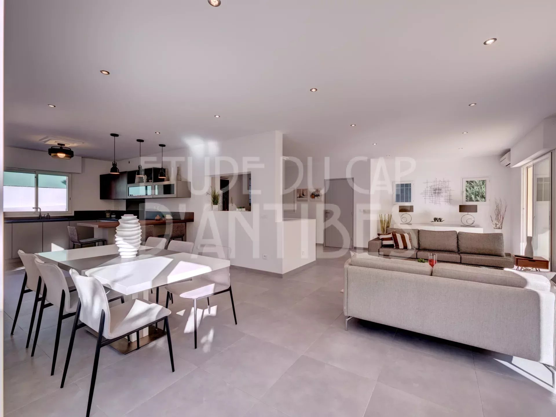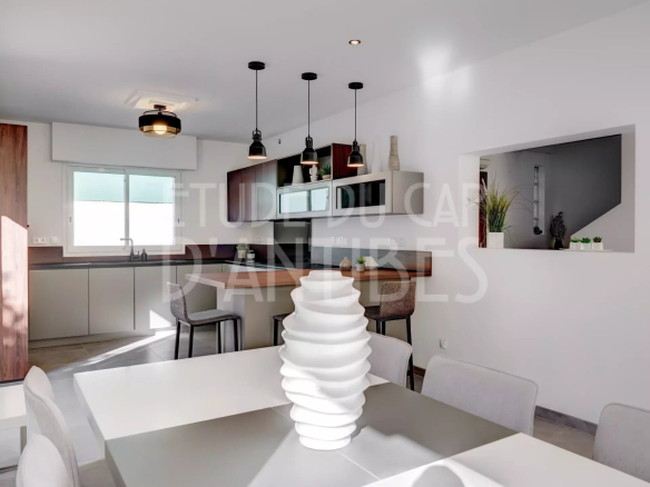 Villa rénovée de 160 m² environ sur 398 m² de jardin. Pièce de vie de 75 m² donnant sur le jardin et la piscine.