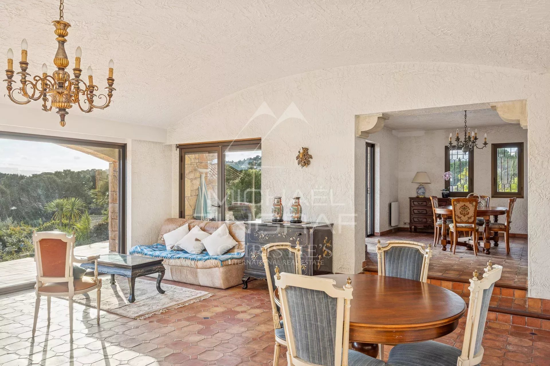 La villa propose cinq chambres, dont trois en rez-de-jardin et deux à l’étage, comprenant une suite parentale avec dressing, salle de bains et terrasse privative bénéficiant d’une vue mer dégagée. Un sous-sol complète l’ensemble avec une chambre de service et un espace à fort potentiel d’aménagement.