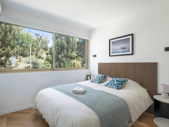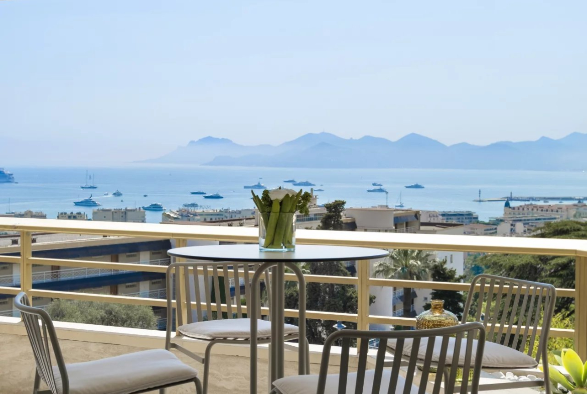 Appartement 3 chambres en suite, terrasse 26 m², piscine, 6ème étage, vue panoramique Cannes et îles de Lérins, quartier Californie.