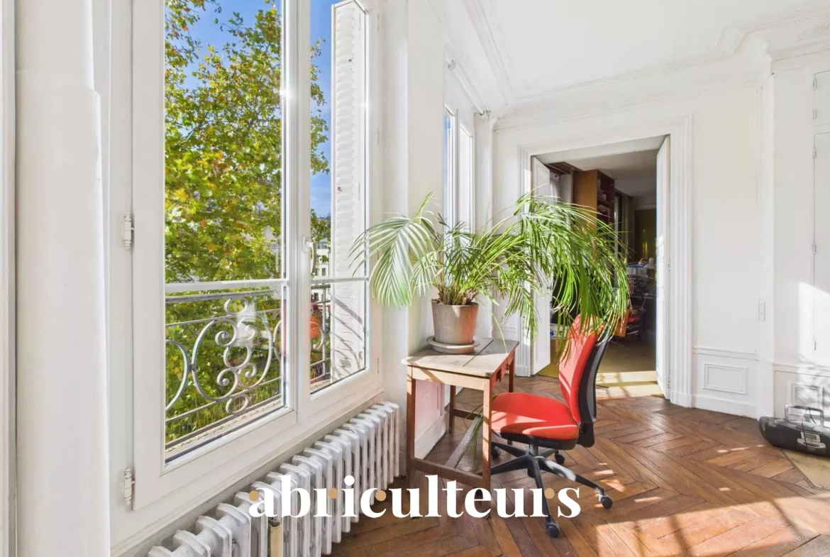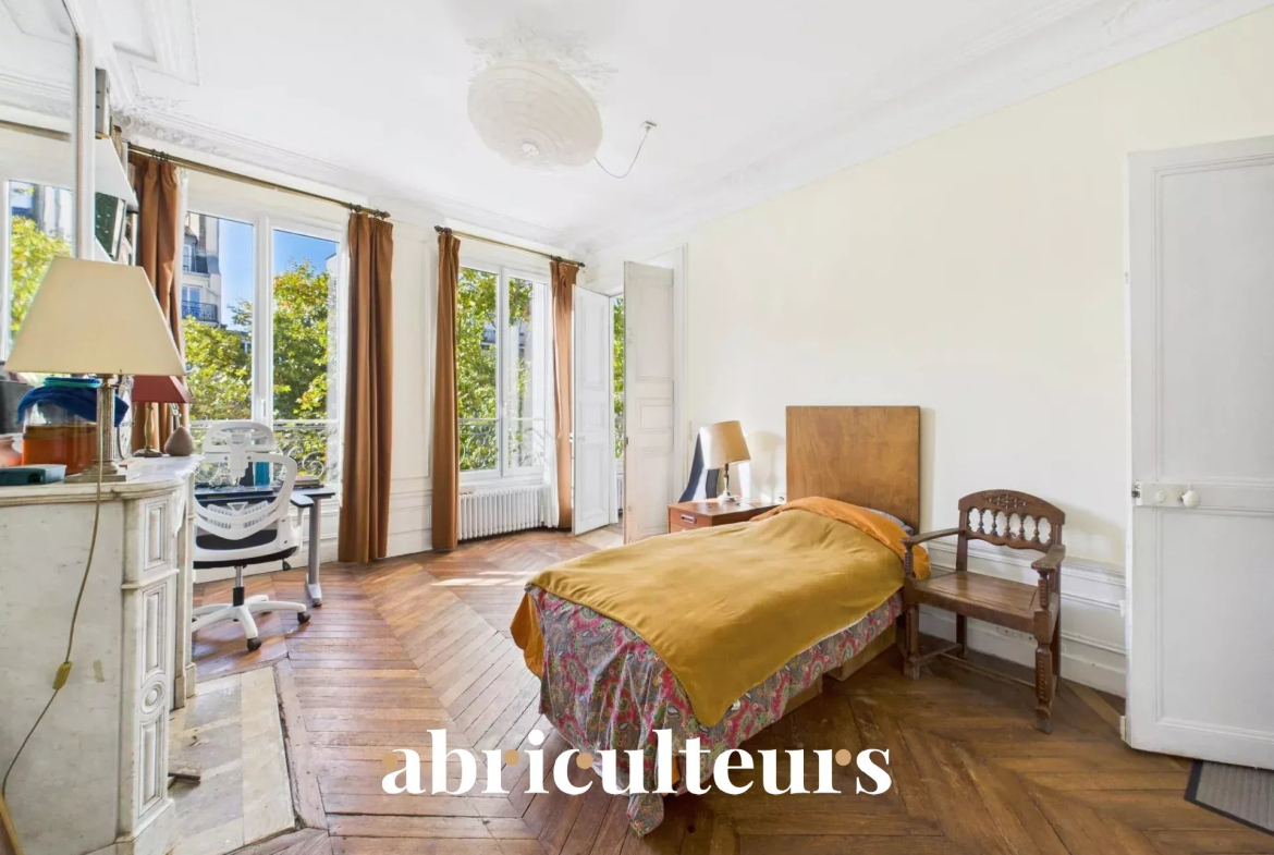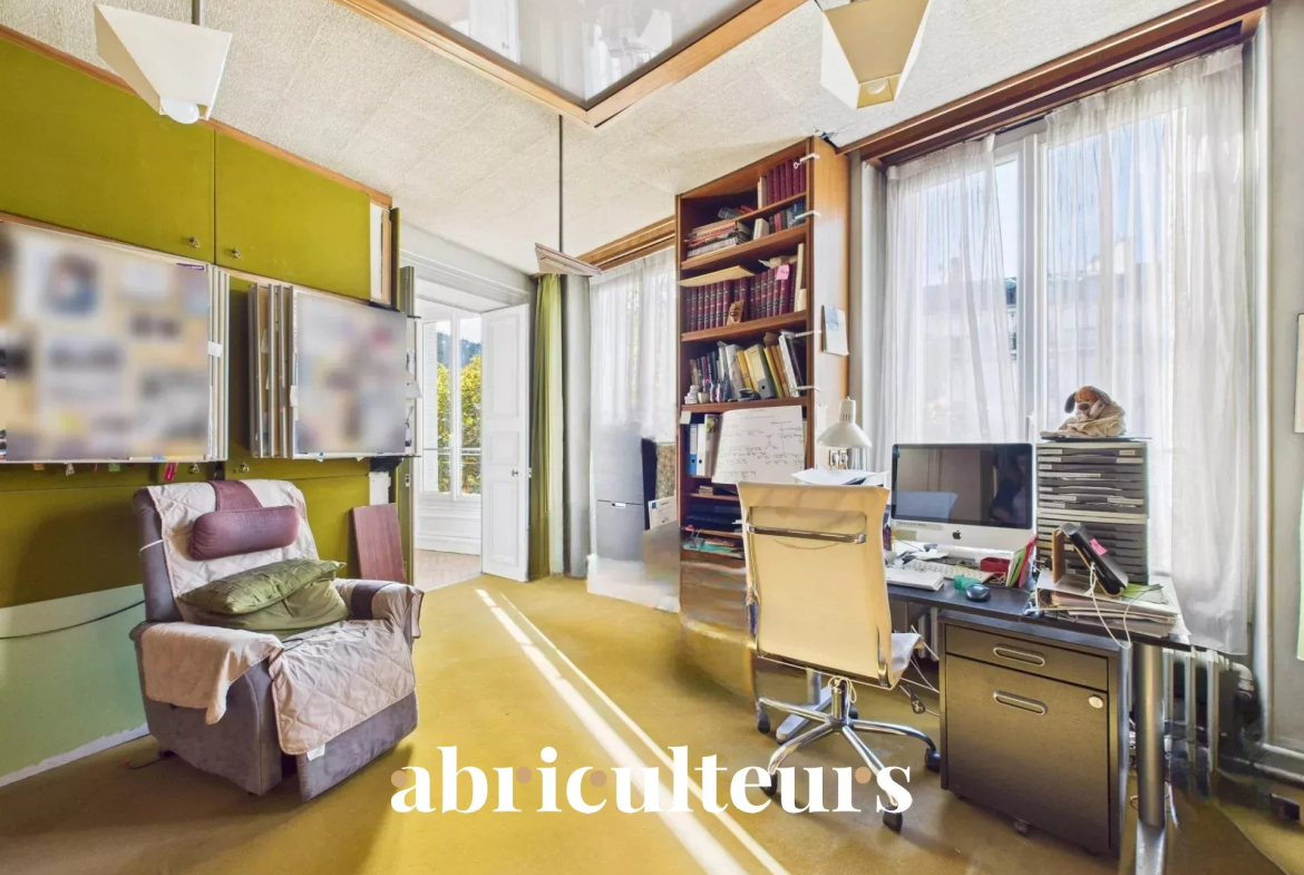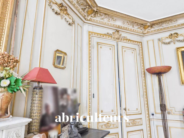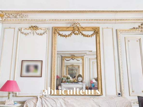L’entrée dessert un vaste bureau pouvant aisément devenir une pièce de vie supplémentaire, ainsi qu’un salon principal orné d’une cheminée, de moulures, d’un parquet point de Hongrie et de décors à la feuille d’or, offrant le charme authentique des appartements parisiens aux belles hauteurs sous plafond.