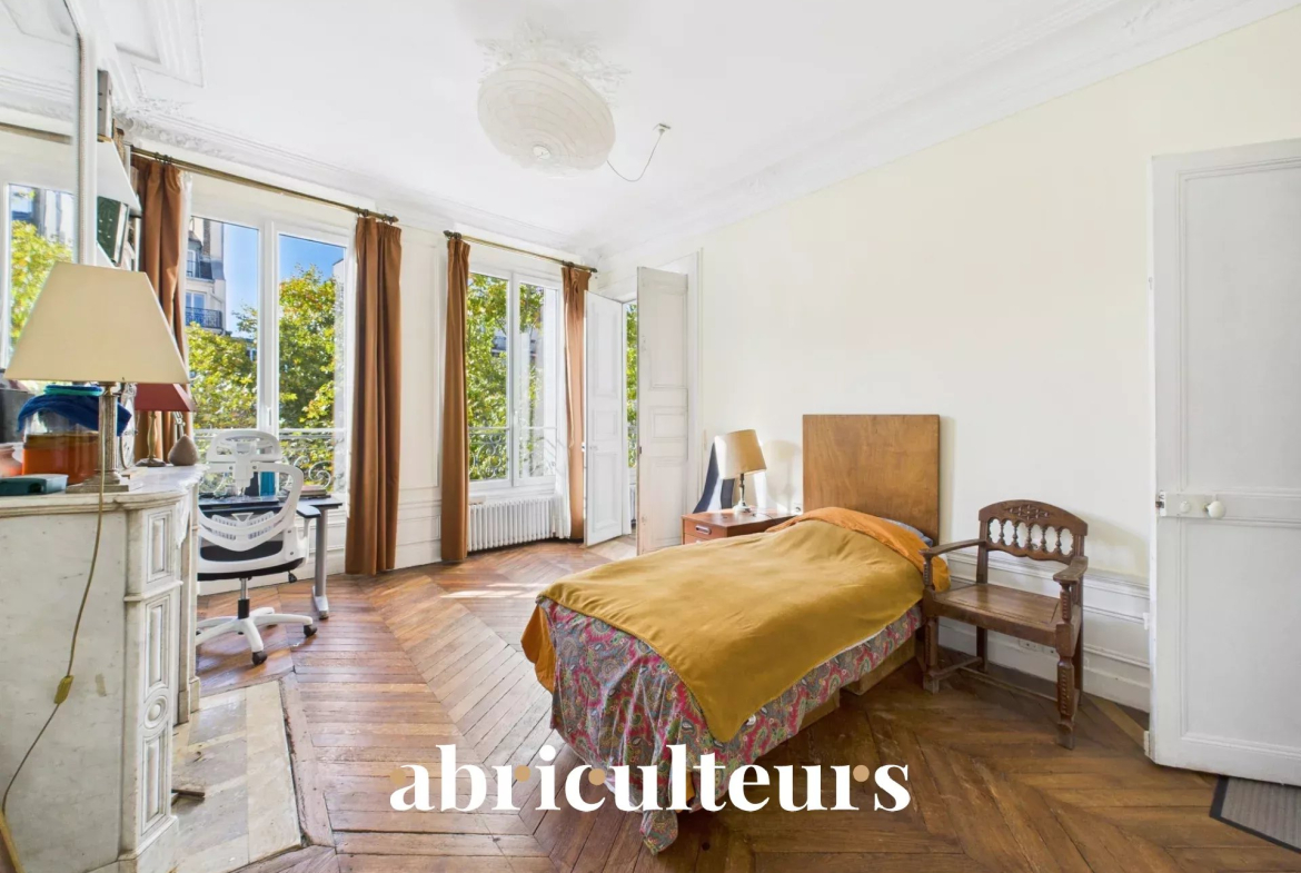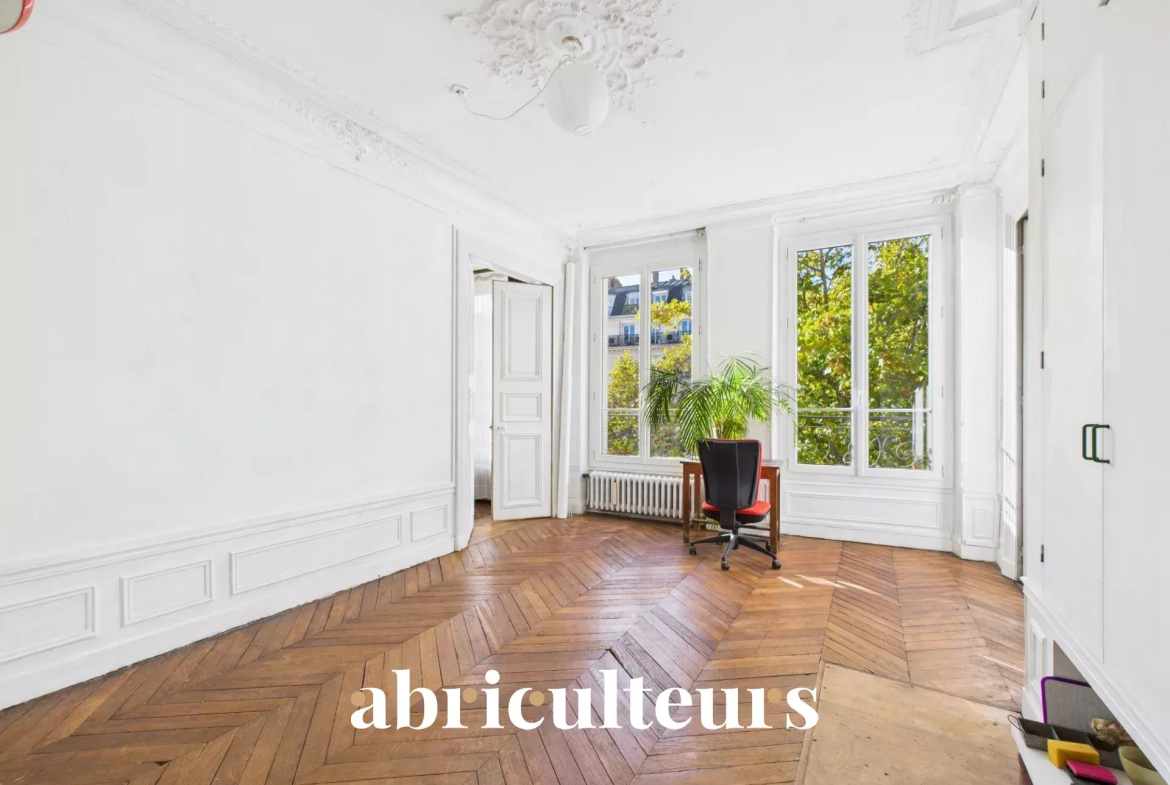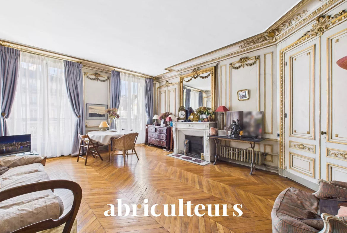 L’entrée s’ouvre sur un grand bureau (pouvant être transformé en pièce de vie) et un salon principal avec cheminée, décoration à la feuille d’or, parquet point de Hongrie, moulures et belles hauteurs sous plafond, typiques du charme parisien.