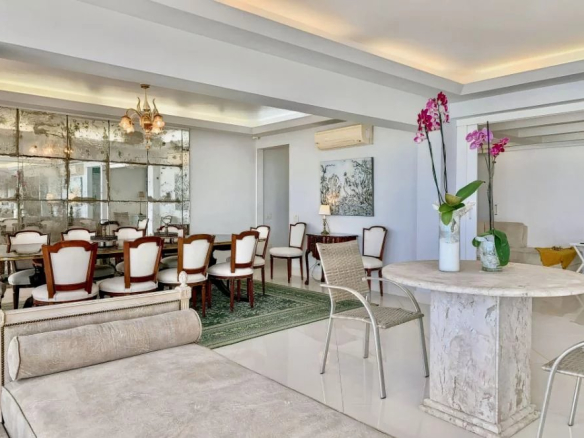 Bel appartement de 250 m2 avec vue sur la plage d’Ipanema et Arpoador, entièrement meublé, équipé et décoré avec goût, composé d’une grande pièce divisée en un salon et une salle à manger avec une table pour 10 personnes. Entre la pièce principale et la cuisine à aire ouverte, on retrouve la salle télé qui peut être fermée par des portes coulissantes. La cuisine moderne et entièrement équipée donne accès à la zone de service avec buanderie et dépendance complète.
