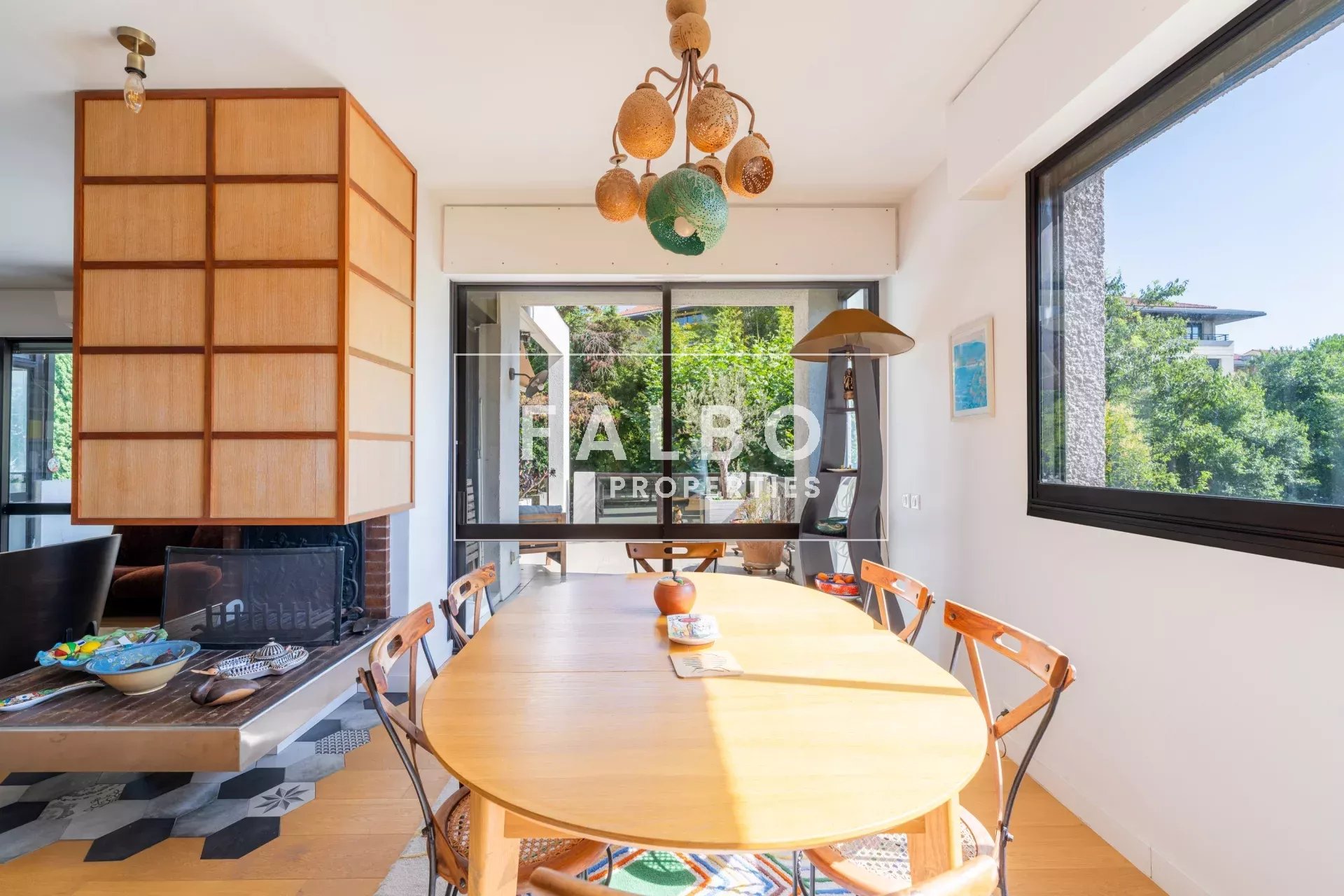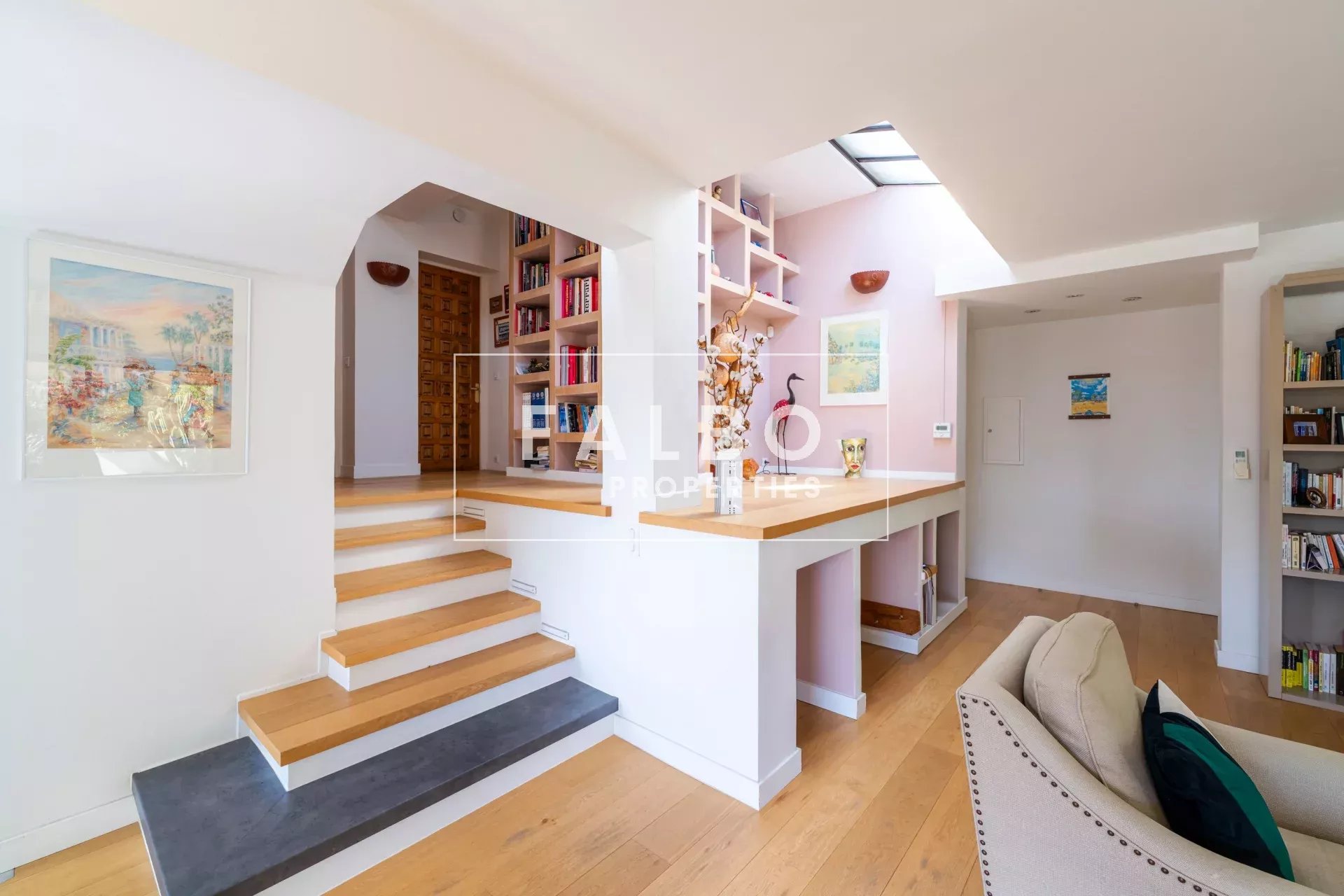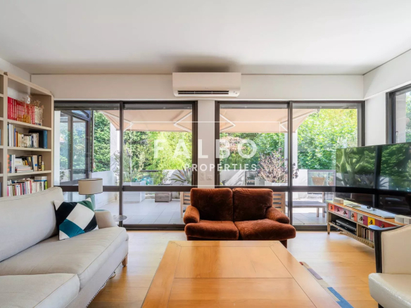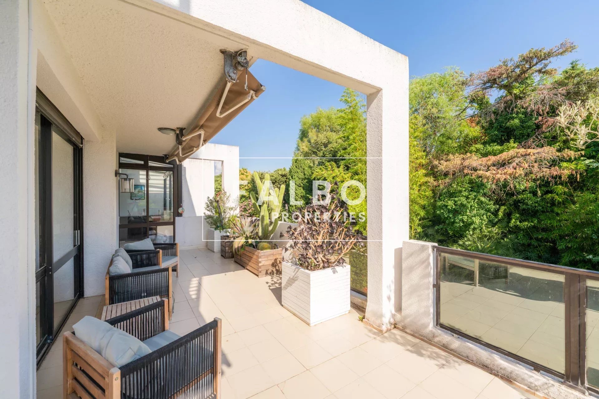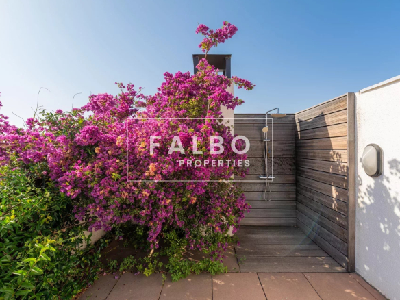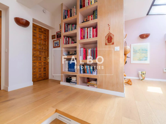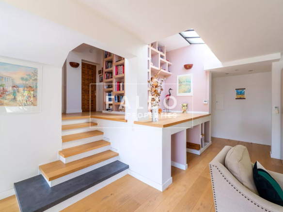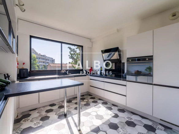 Superbe appartement en semi-duplex de 145 m² en loi Carrez avec cuisine équipée, grand séjour de 63m² et sa cheminée prolongé par une première terrasse, 4 chambres, dont une suite parentale avec dressing, 3 salles d’eau. Le toit-terrasse de 45m² est aménagé avec une cuisine d’été attenante, exposé sud et offre un aperçu mer. Voilà une habitation particulièrement agréable, très lumineuse, au calme absolu et entourée d’arbres, sans vis-à-vis.