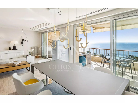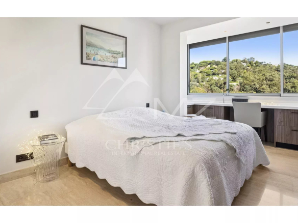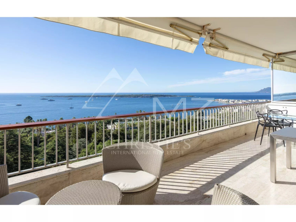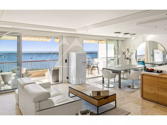 L’appartement, parfaitement entretenu, se distingue par son vaste salon lumineux avec une cuisine ouverte moderne entièrement équipée. La magnifique terrasse, orientée plein sud, offre une vue imprenable sur la mer Méditerranée et les célèbres îles de Lérins, créant un espace idéal pour se détendre ou recevoir des invités.