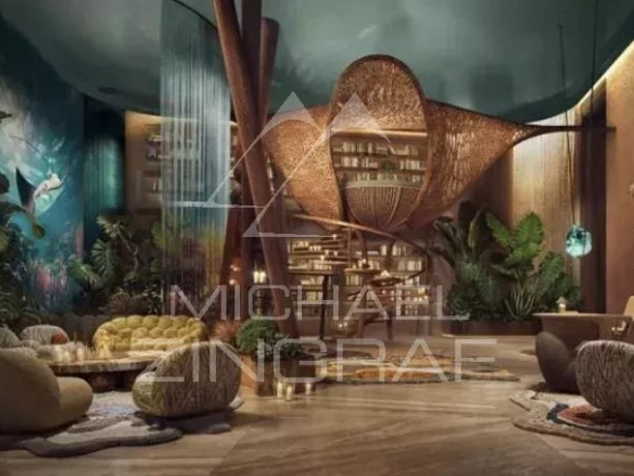 L’immeuble dispose de trois piscines, dont une spectaculaire terrasse de piscine avec bar extérieur et changing room. Un jardin de cristal apporte une touche architecturale unique et raffinée.