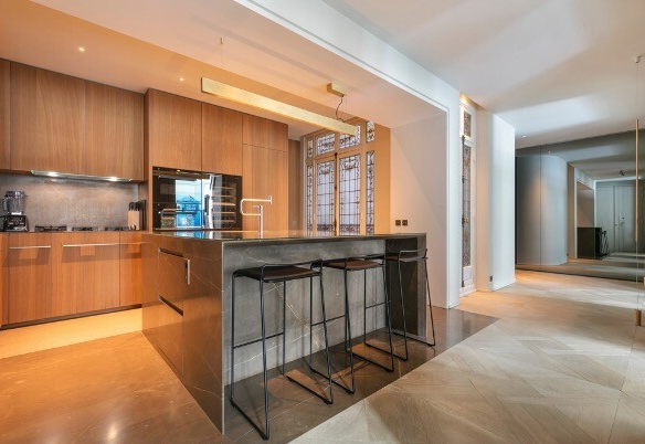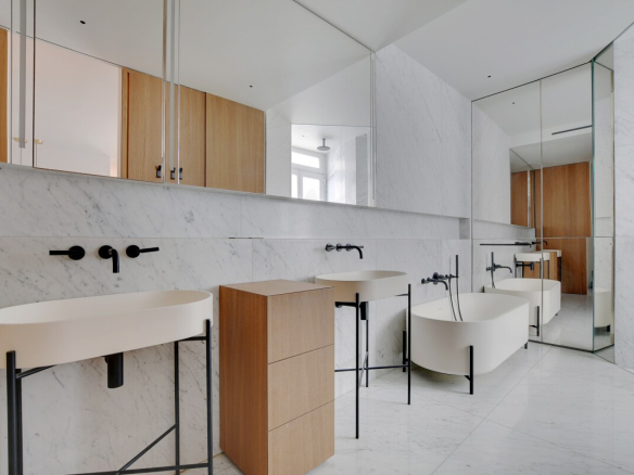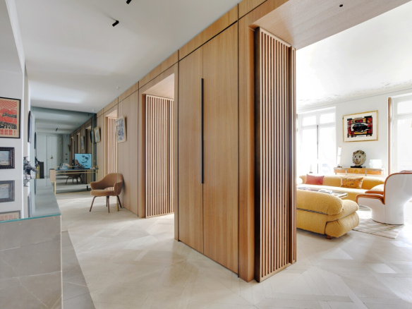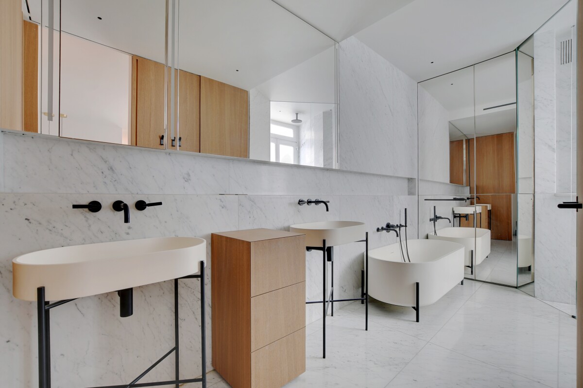 Un couloir à l’ambiance feutrée, animé de jeux de miroirs et d’éclairages, accompagne ensuite la transition vers la partie nuit. Celle-ci se compose d’une suite parentale sur cour, dotée d’un dressing en placage de noyer, verre et cuir, et d’une salle de bains en marbre, ainsi que de deux autres chambres sur cour, chacune disposant d’un accès direct à une salle de bains en feuille de pierre.