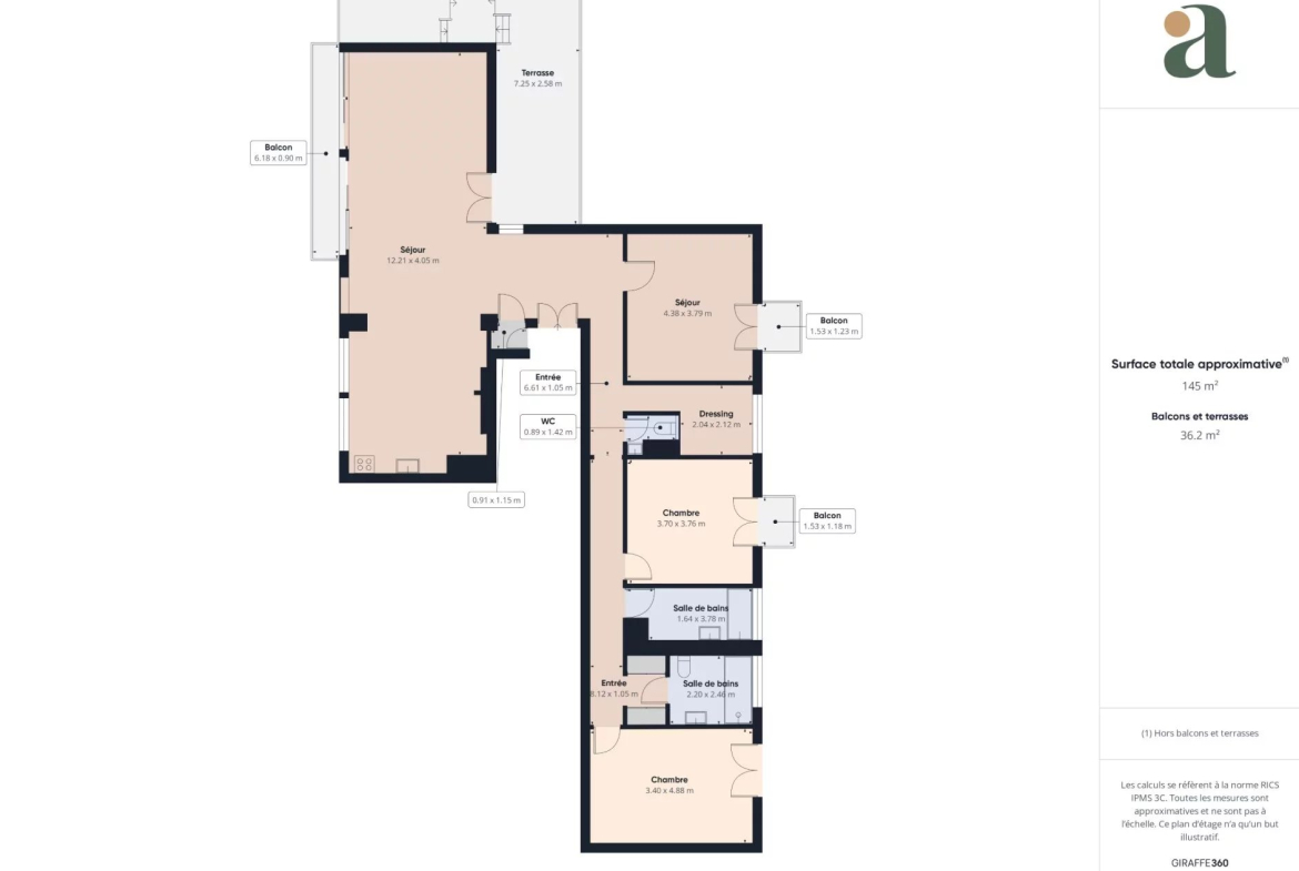 L’espace nuit propose trois chambres confortables, chacune agrémentée de son propre balcon, d’un dressing sur-mesure et d’une salle d’eau ou salle de bains privative avec toilettes. Un WC invités complète cet étage. L’ensemble de l’appartement bénéficie de nombreux rangements intégrés, assurant un confort de vie optimal.