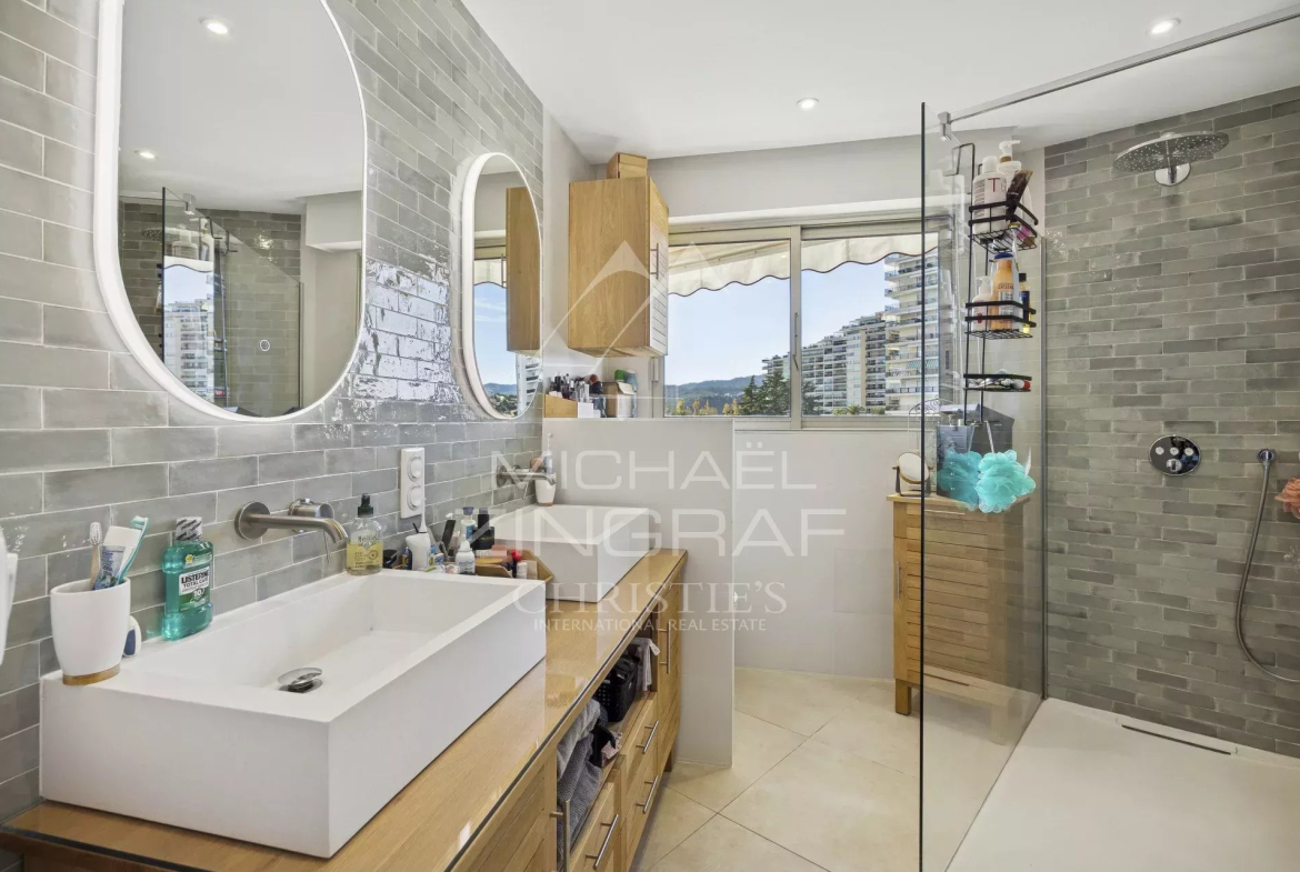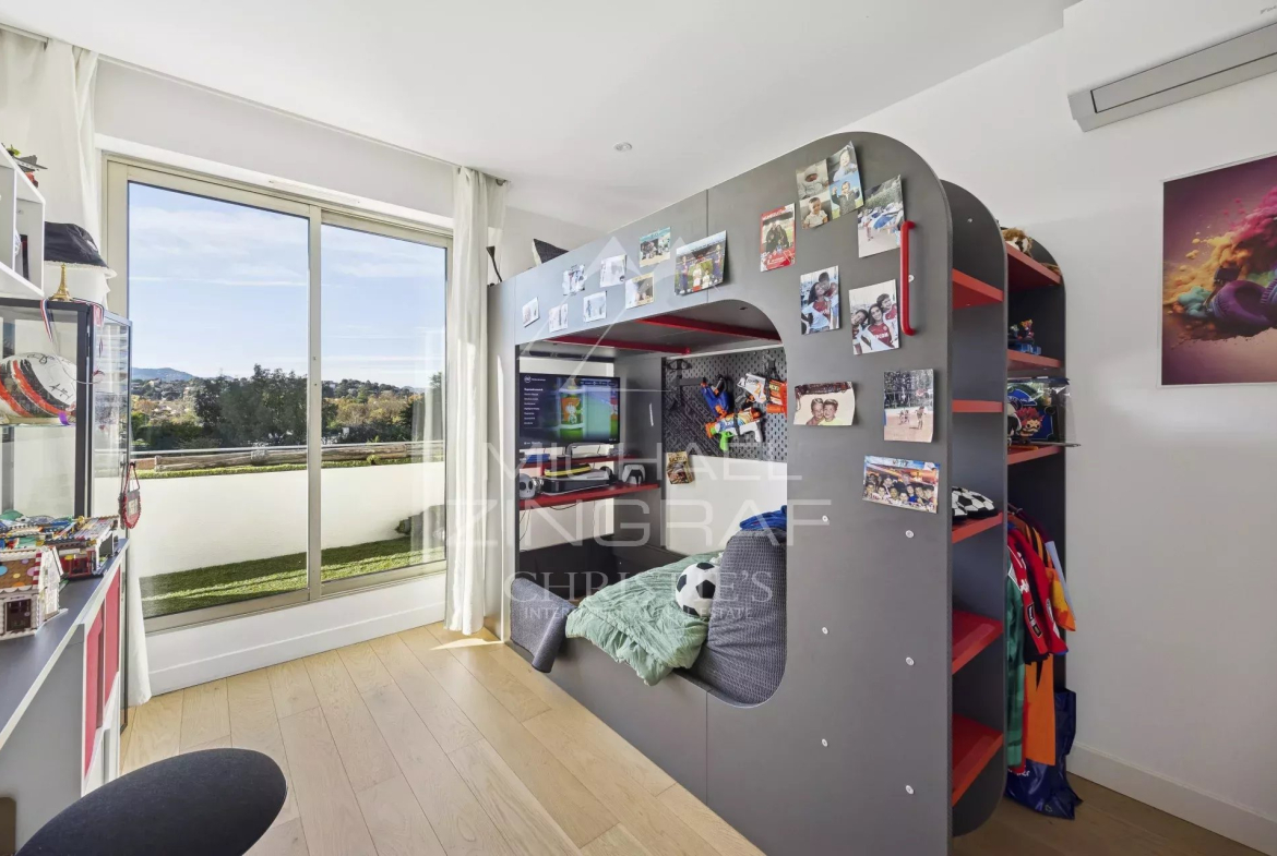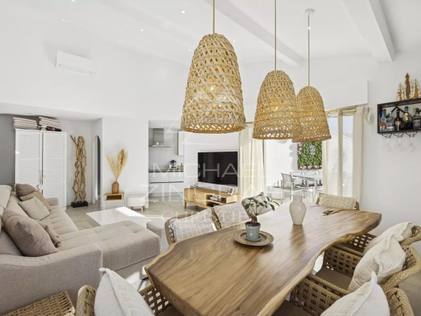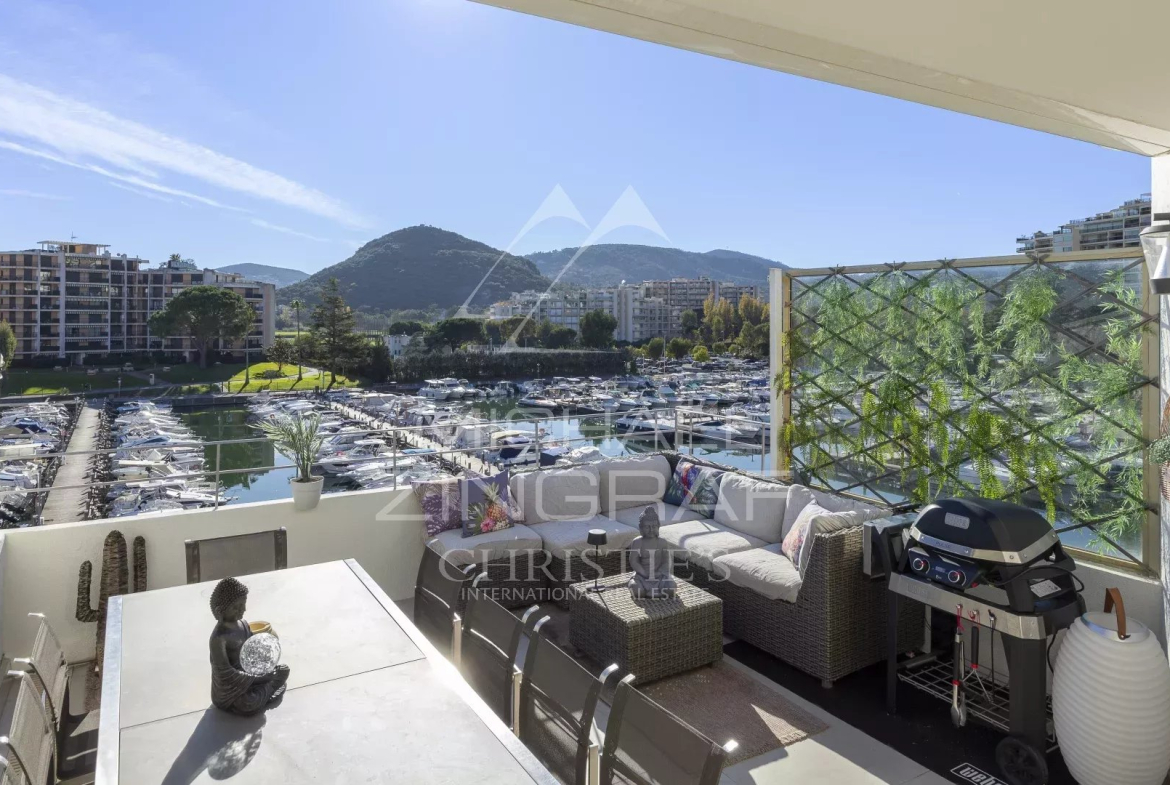 Superbe appartement entièrement rénové de 95,52 m² au 3ᵉ et dernier étage sur l’Île de Cannes Marina, avec exposition Sud/Ouest et vue dégagée sur la marina et le San-Peyre. Il offre une lumineuse pièce de vie salon/salle à manger avec une belle hauteur sous plafond, cuisine équipée, 3 chambres dont une en-suite, 2 salles de bains et 2 terrasses d’environ 17 et 23 m². Cet appartement aux prestations haut de gamme, au coeur d’une résidence avec piscine et gardien, dispose d’un garage fermé. Proche des commerces, des plages et à 35 minutes de l’aéroport international de Nice.