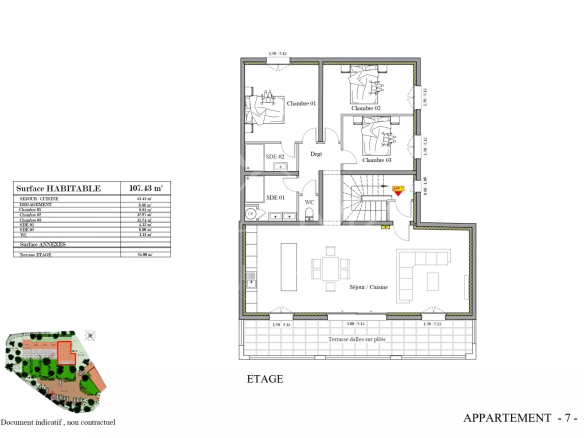Il contient trois chambres, dont une suite parentale avec sa propre salle d’eau, une seconde salle de bains, un WC séparé, et d’une belle pièce de vie d’environ 50m2 avec cuisine ouverte sur le séjour donnant sur une agréable terrasse pour profiter des extérieurs et du soleil.