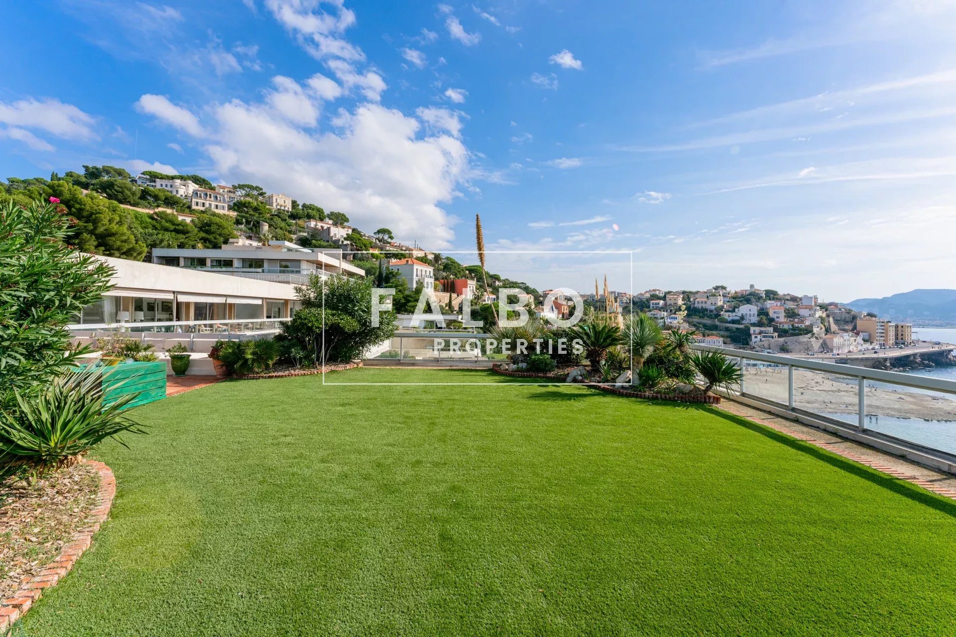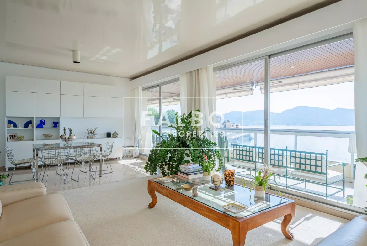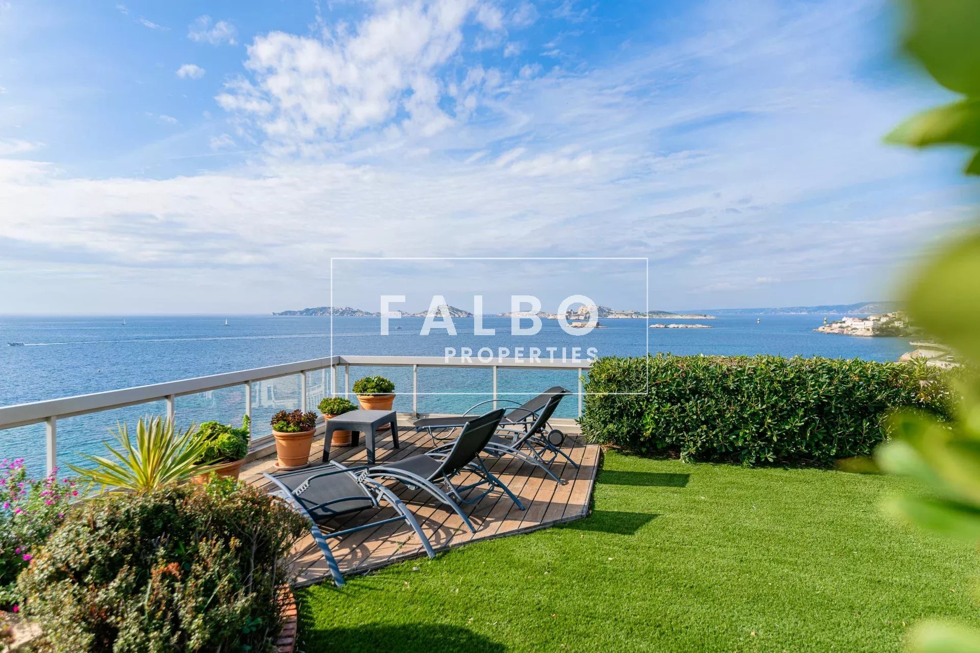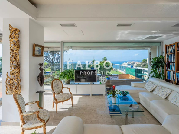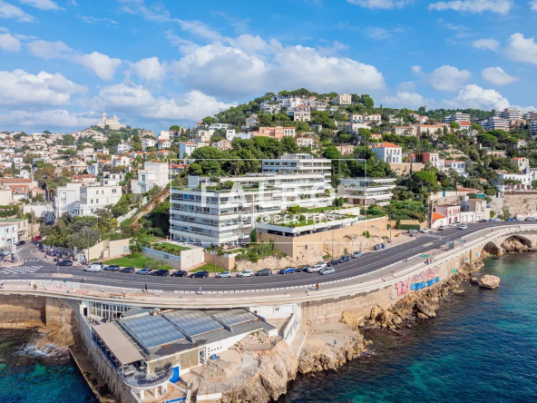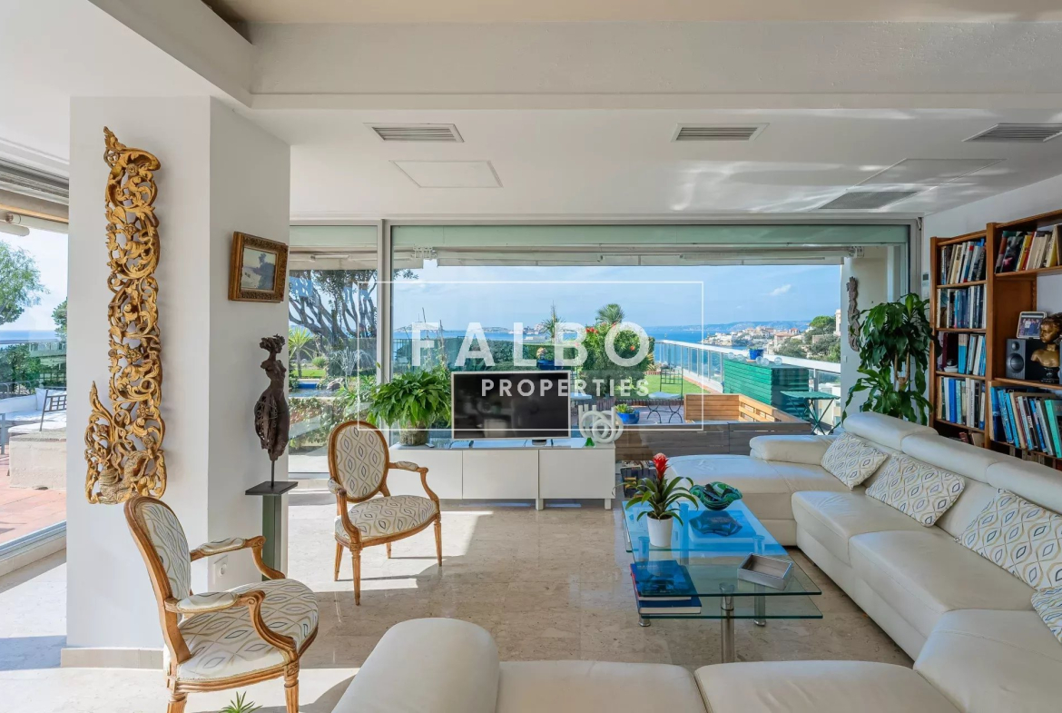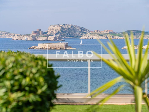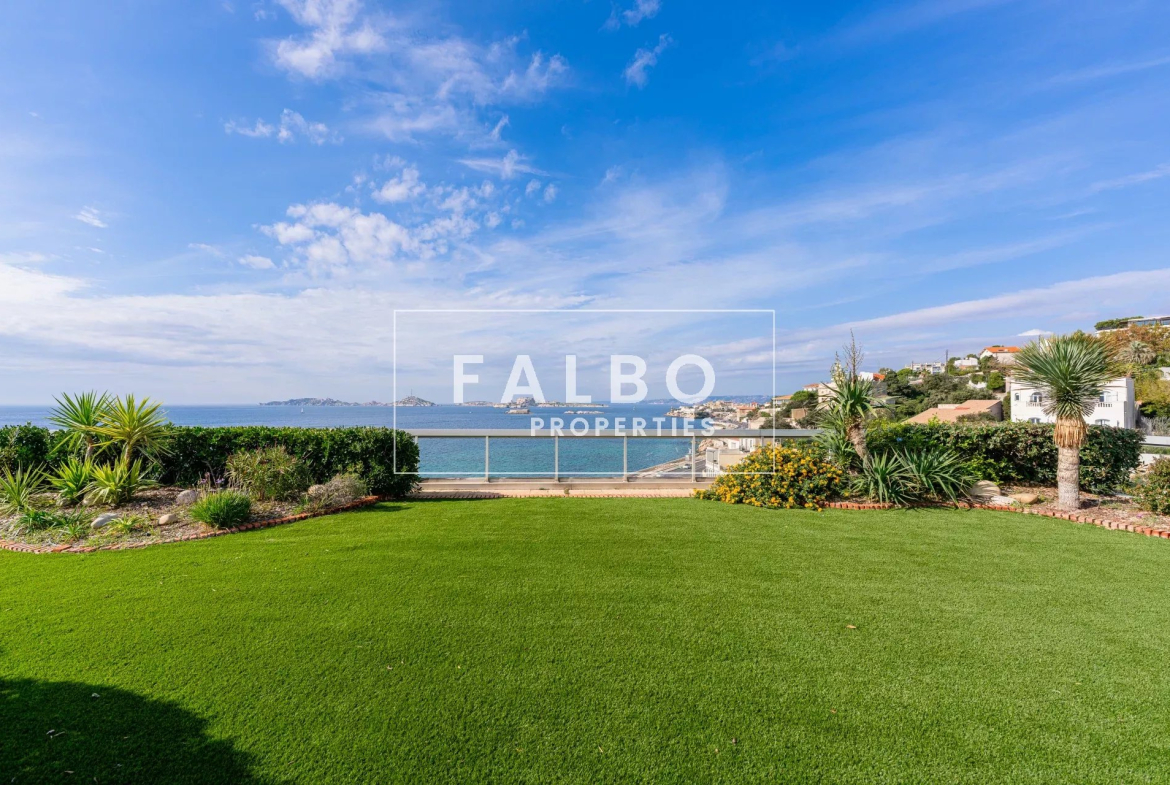 Très rare à la vente, telle une villa sur le toit, penthouse de 182 m2 avec un vaste séjour très largement ouvert par des baies surplombant la mer et la rade de Marseille, prolongé par un jardin suspendu d’environ 500 M2.