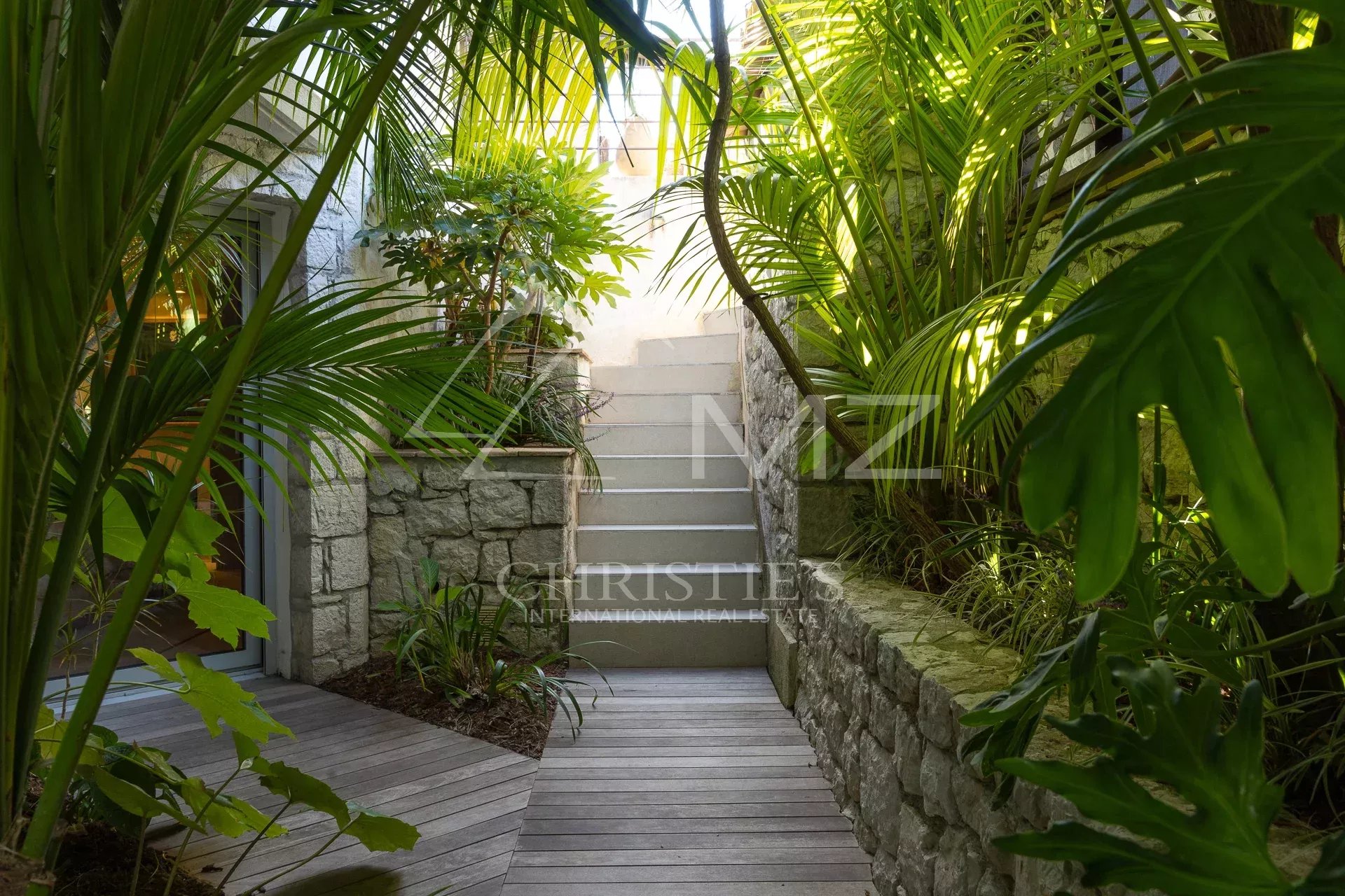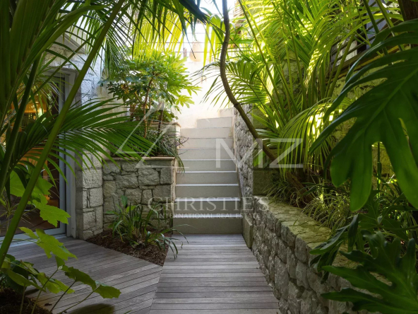 Le jardin privatif, véritable oasis tropicale, est équipé d’une piscine chauffée au sel, entourée d’une végétation luxuriante qui rappelle les paysages de Bali. Les murs extérieurs en pierre apportent une touche d’authenticité et d’intimité à cet espace extérieur exceptionnel.