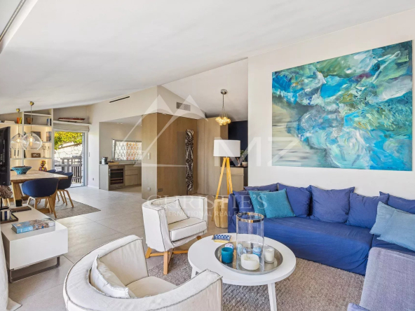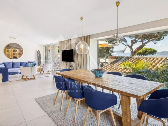 Dès votre entrée, vous serez séduit par le vaste séjour lumineux, qui s’ouvre sur une cuisine moderne entièrement équipée. La pièce de vie bénéficie d’un accès direct à une magnifique terrasse tropezienne d’environ 25 m², offrant une vue imprenable sur la mer et la baie de Cannes.