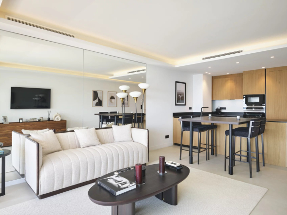 L’espace de vie comprend un salon lumineux avec cuisine ouverte, idéal pour profiter de la lumière et de la vue sur la Croisette. L’appartement dispose de deux grandes chambres en suite, chacune équipée de sa salle d’eau, garantissant confort et intimité.