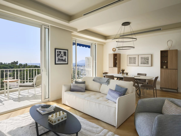 Situé dans le prestigieux secteur de la Croisette à Cannes, cet appartement de réception de 100 m² au 5ème étage offre une vue panoramique imprenable sur la mer et le port Canto.