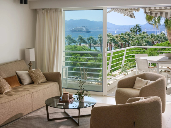 Dès l’entrée, la pièce de vie séduit par ses volumes et sa luminosité. Le séjour, prolongé par une terrasse de 13 m², offre une vue mer dégagée, idéale pour profiter pleinement du climat cannois. La cuisine ouverte, élégamment intégrée à l’espace de réception, participe à l’atmosphère contemporaine et conviviale de l’ensemble.