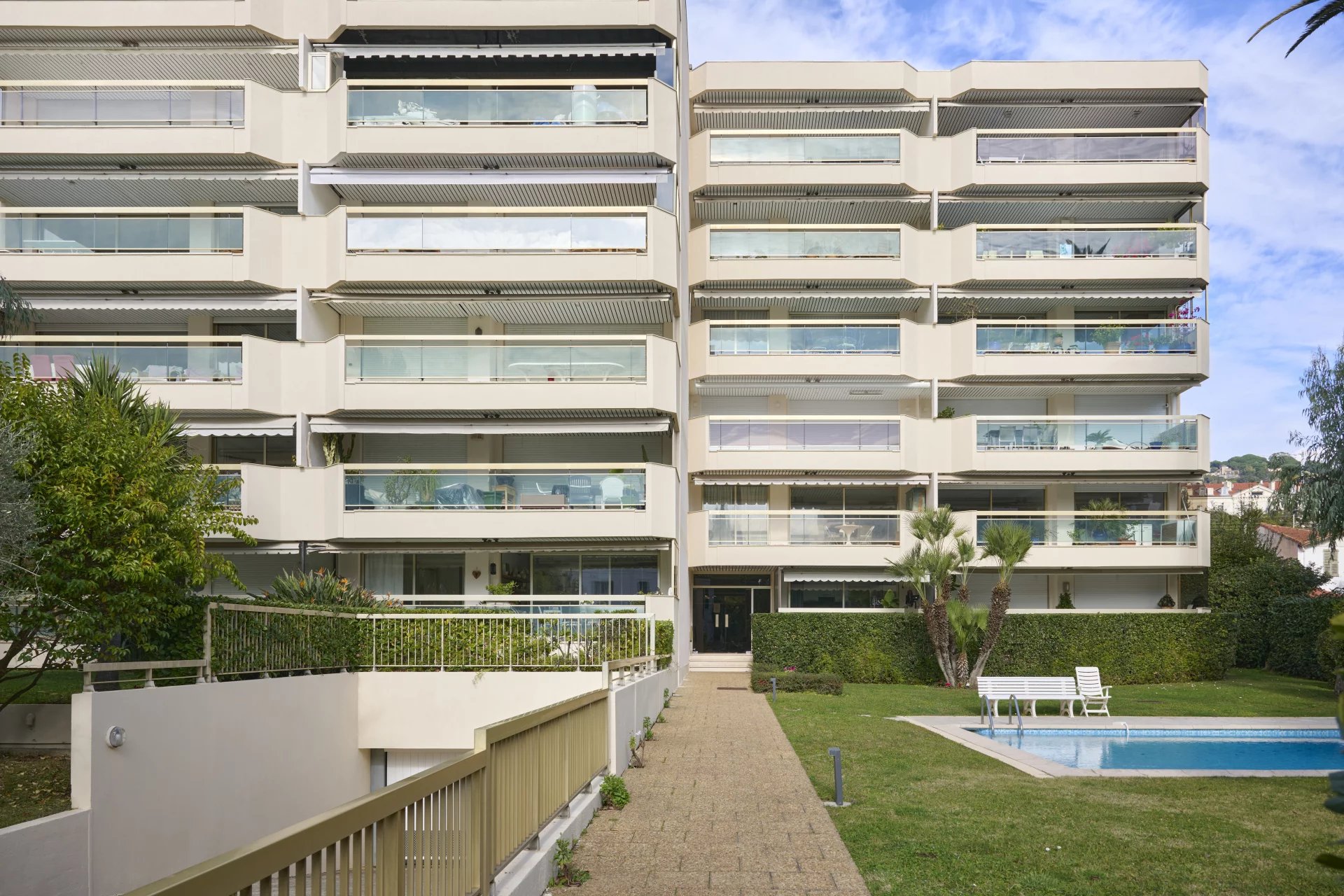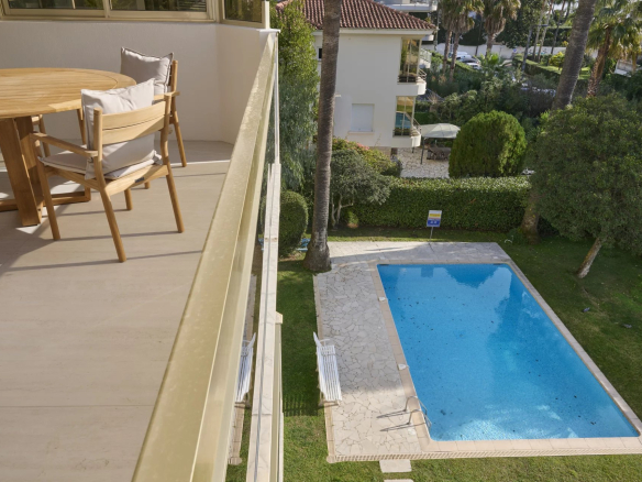 Appartement 100 m² à Cannes Palm Beach, vue mer depuis terrasse 21 m², 3 chambres en suite, cave et 2 parkings inclus, piscine collective.