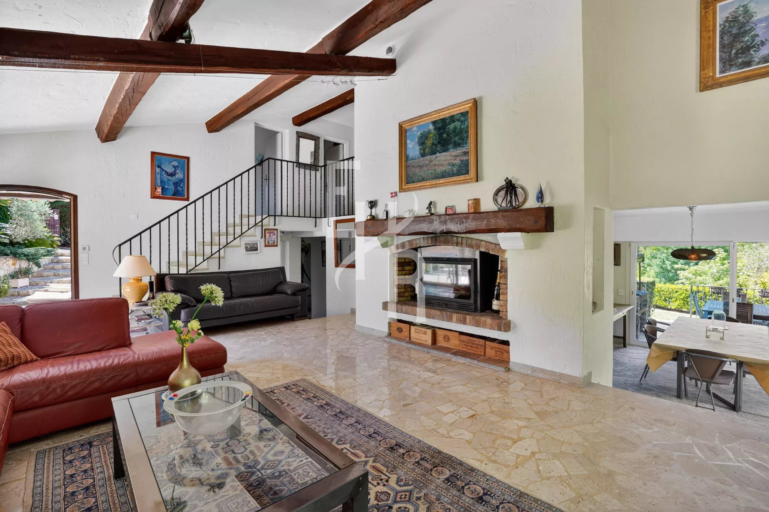 L’intérieur a été pensé pour la convivialité avec un espace de vie ouvert sur la cuisine, structuré autour d’une magnifique cheminée. C’est le lieu idéal pour des soirées d’hiver chaleureuses après avoir profité du soleil azuréen tout au long de la journée. La villa dispose de quatre chambres spacieuses en suite, ainsi que d’un bureau polyvalent pouvant facilement faire office de cinquième chambre.