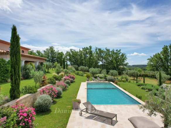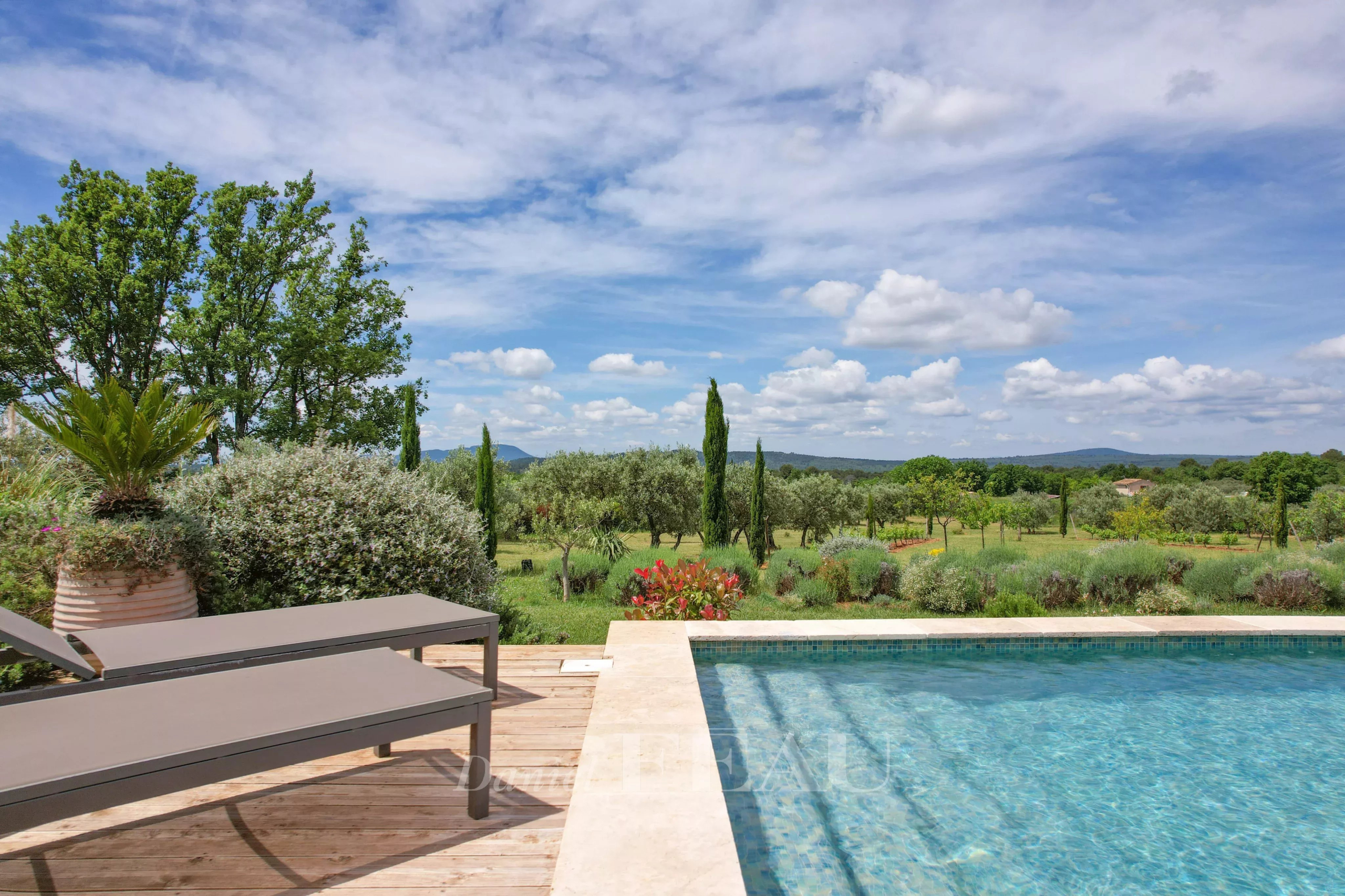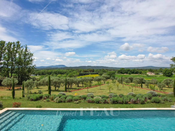 Terrasses avec vue sur le jardin paysager, la piscine, et le verger au loin qui recense plus de 70 oliviers, des chênes truffiers, abricotiers, pêchers, cerisiers, pruniers et figuiers.
