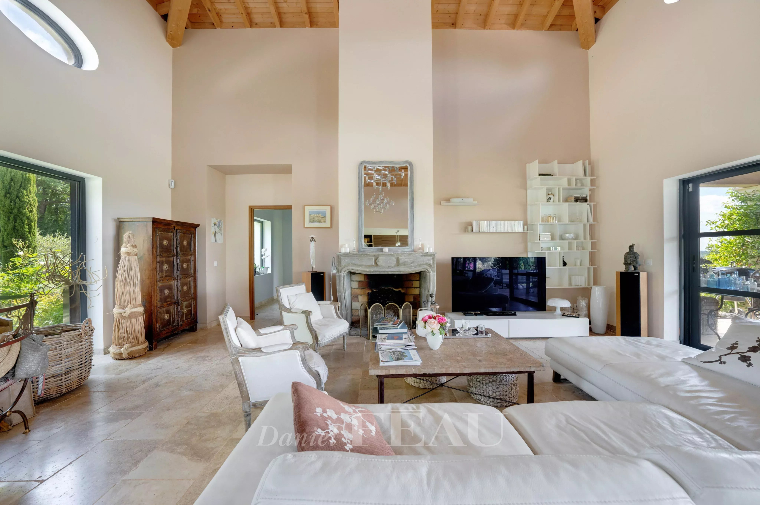 La maison présente 260 m² habitables de plain-pied et s’articule autour d’une pièce de vie de plus de 70 m², avec cheminée, cuisine ouverte et ouvertures au sud sur les terrasses et le jardin.