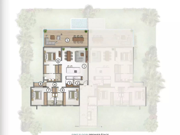 L’appartement au rez de jardin donne accès aussi bien à un espace vert privatif qu’à une petite piscine pour siroter un cocktail en regardant le couché de soleil.