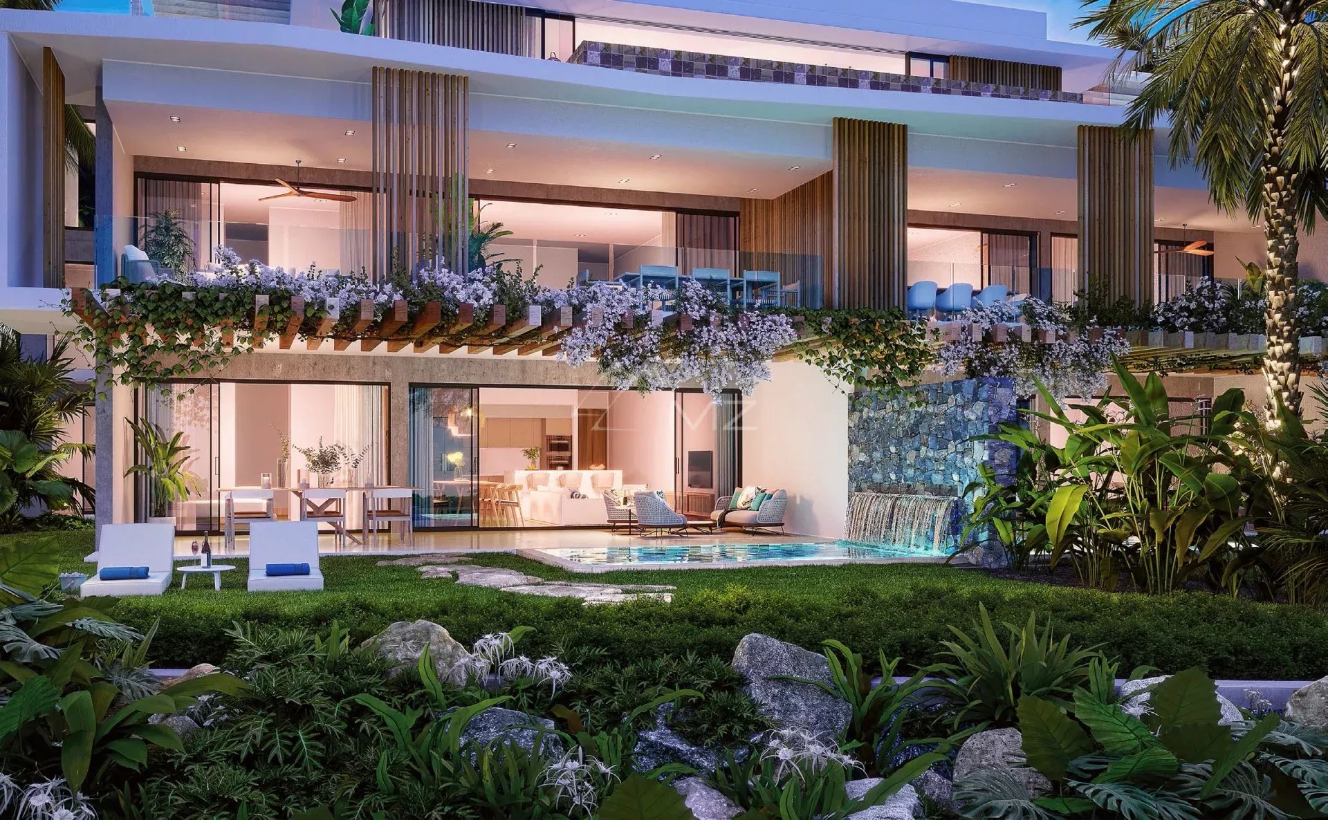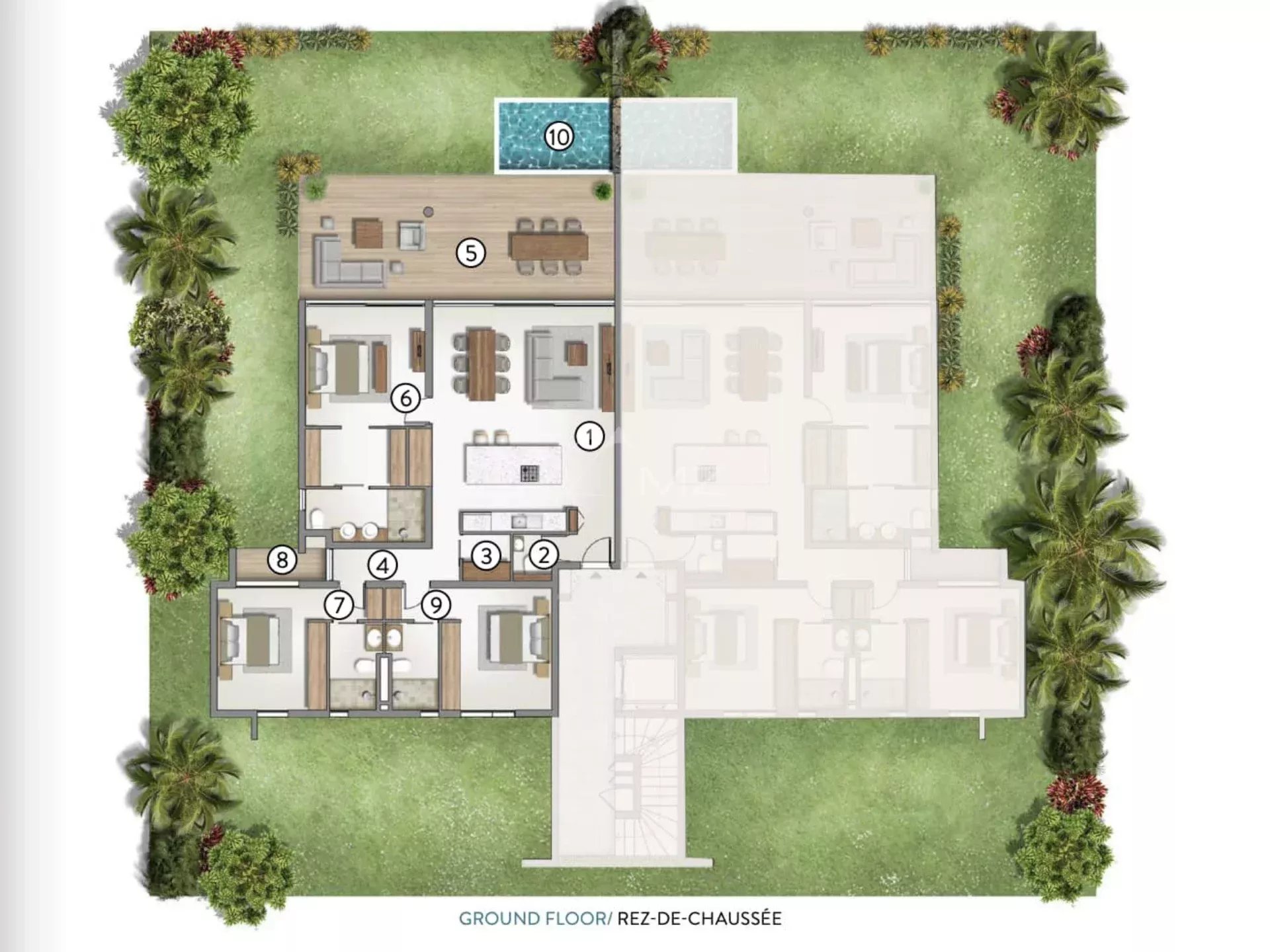 L’appartement au rez de jardin donne accès aussi bien à un espace vert privatif qu’à une petite piscine pour siroter un cocktail en regardant le couché de soleil.