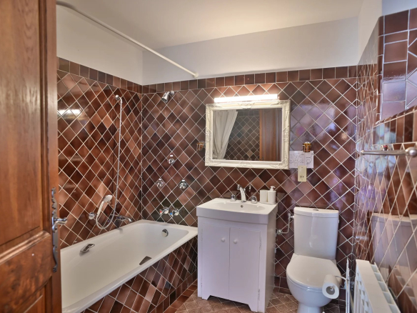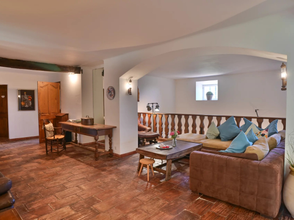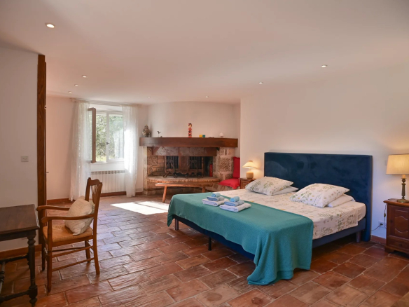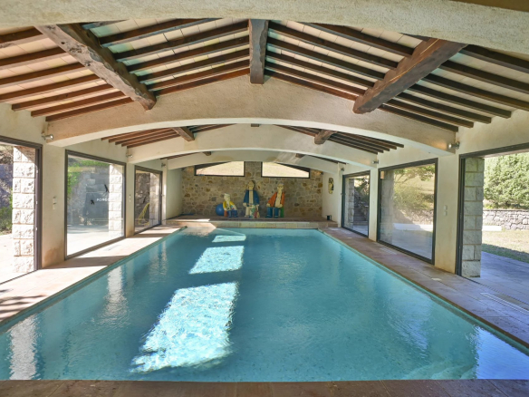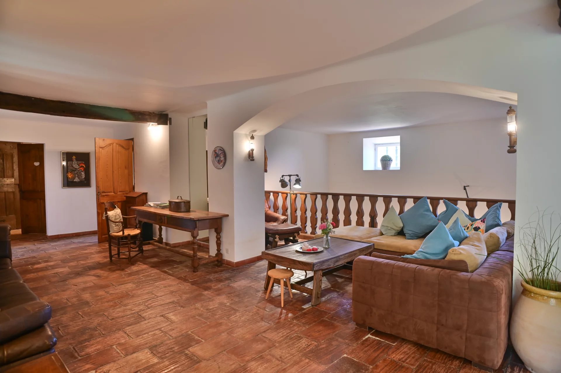 Premier étage : vaste salon en mezzanine, suite parentale avec cheminée ouverte et salle de bains attenante, deux chambres supplémentaires (dont une actuellement utilisée comme bureau), une autre salle de bains et WC séparés. À ce niveau, vous bénéficierez également du luxe rare d’une piscine intérieure avec sauna et accès direct aux jardins.