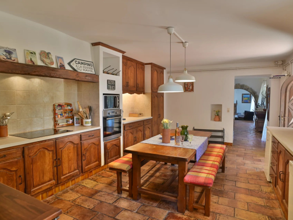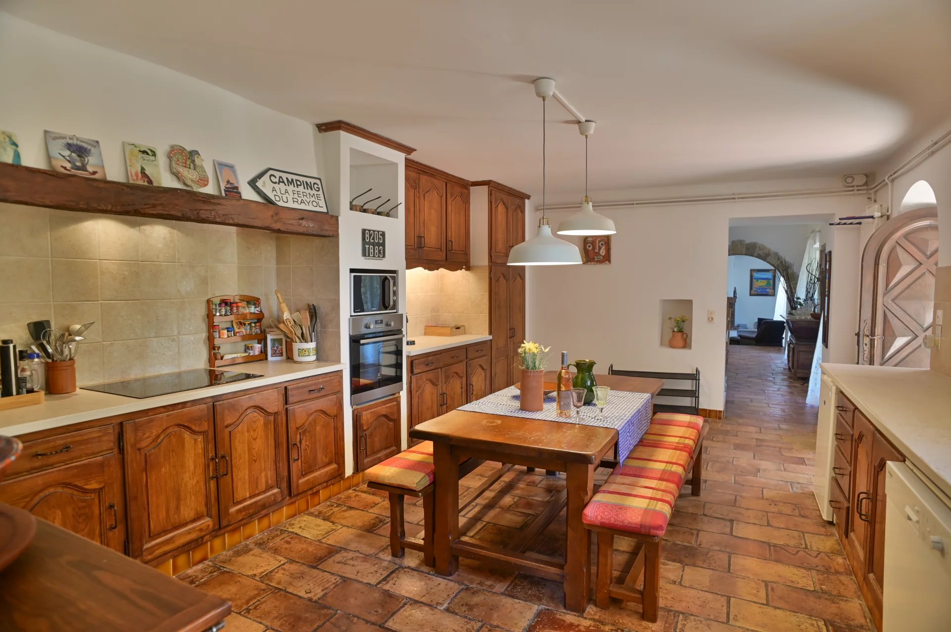 Rez-de-chaussée : cuisine provençale traditionnelle ouvrant sur une terrasse couverte avec four à pain d’origine, salle à manger conviviale et salon chaleureux avec cheminée.