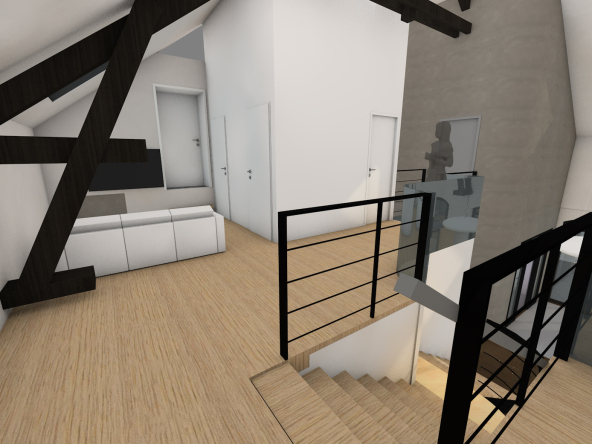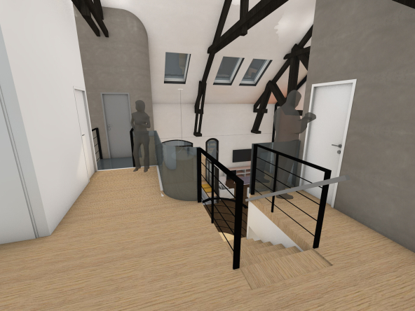 1 espace mezzanine ouvert TV, bibliothèque, dégagement pour les chambres, avec 2 grands velux dont 1 atelier, accès direct au grenier.