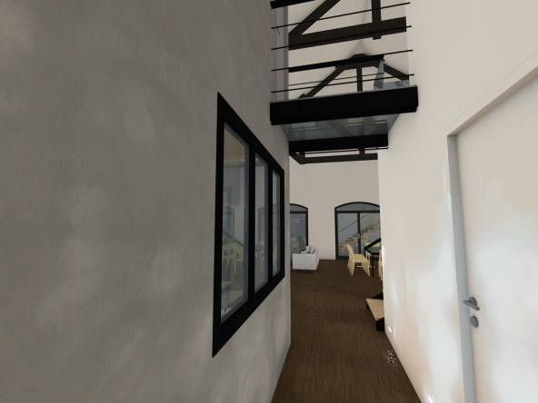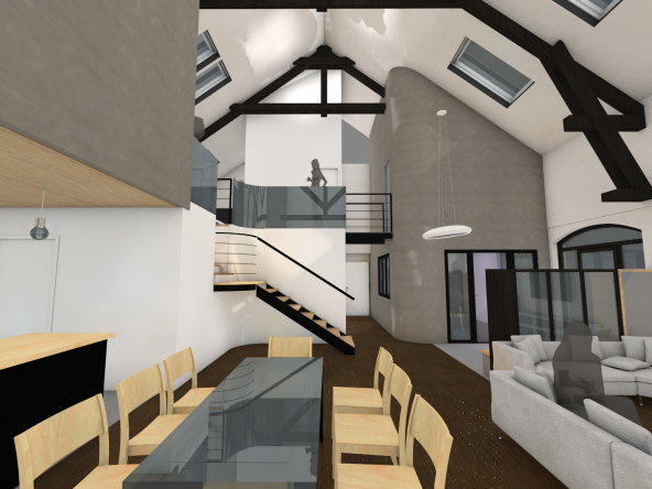 Grandes portes fenêtre cintrées en aluminium noires, 3 grands Vélux motorisés illumine le RDC.
