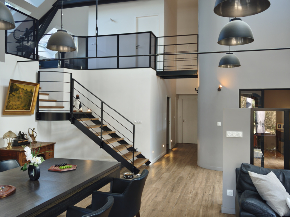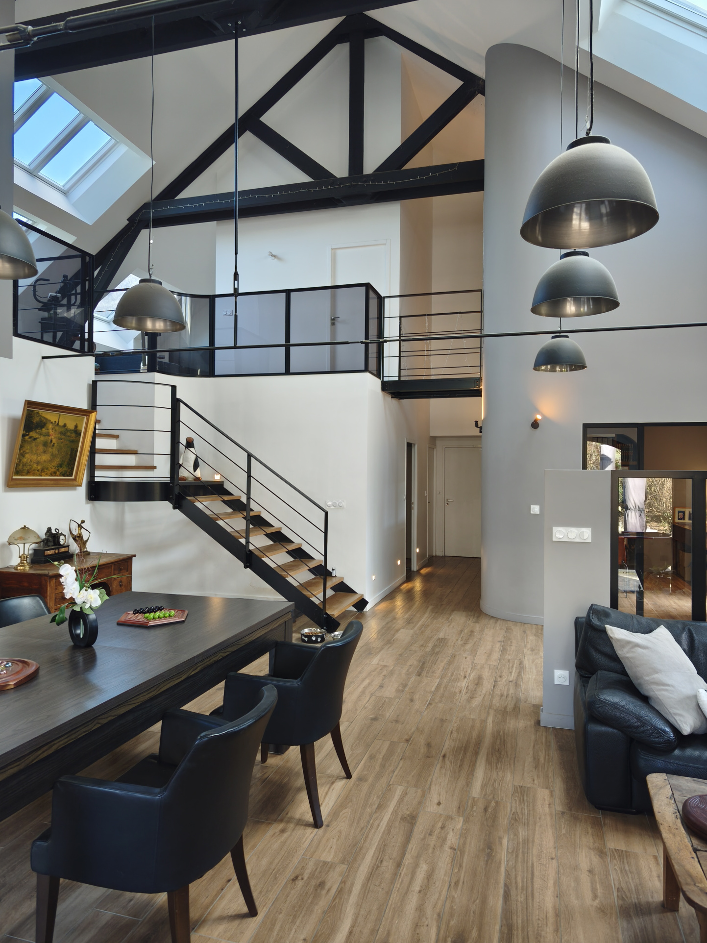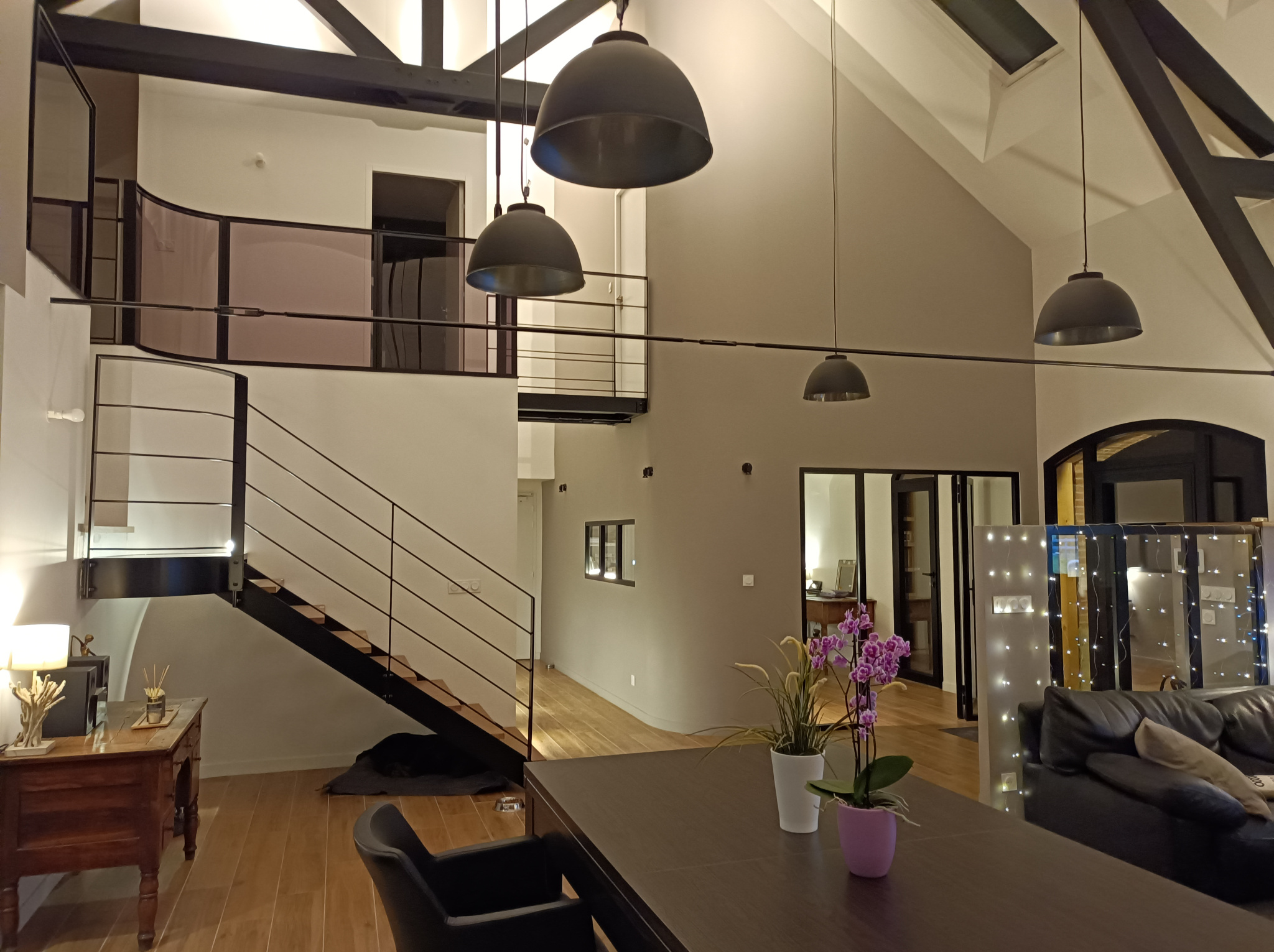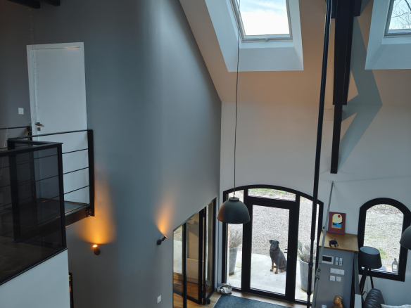 Grandes portes fenêtre cintrées en aluminium noires, 3 grands Vélux motorisés illumine le RDC.