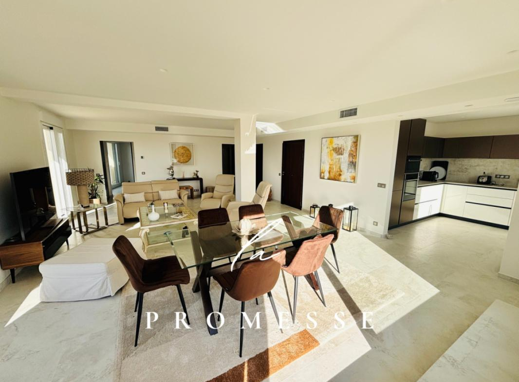 Un grand double séjour de 46 m2, orienté plein sud , s’ouvre sur une vaste terrasse ensoleillée de près de 100 m2, dotée d’une vue panoramique sur l’OCEAN et la chaîne de MONTAGNES. Cuisine ouverte et équipée.