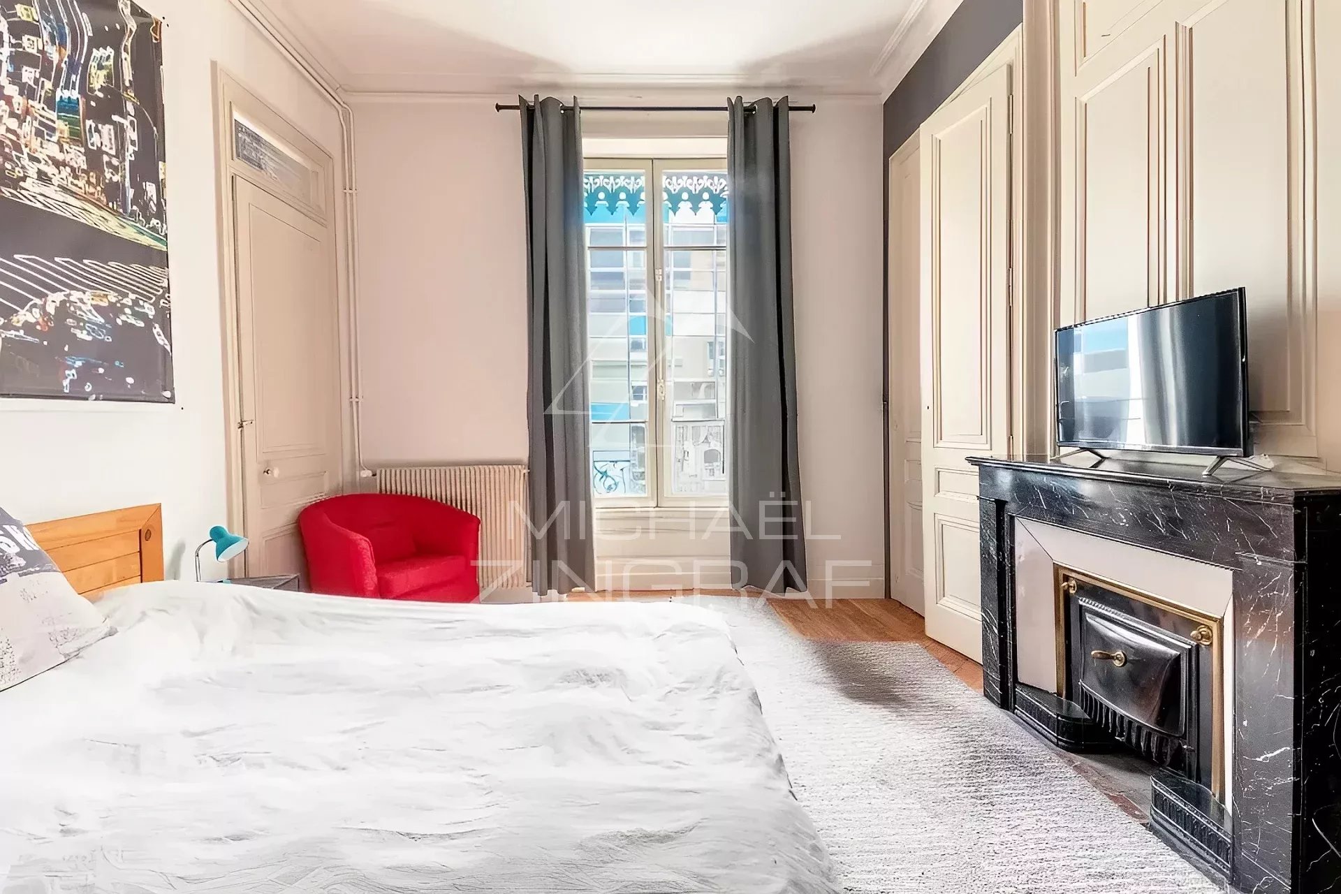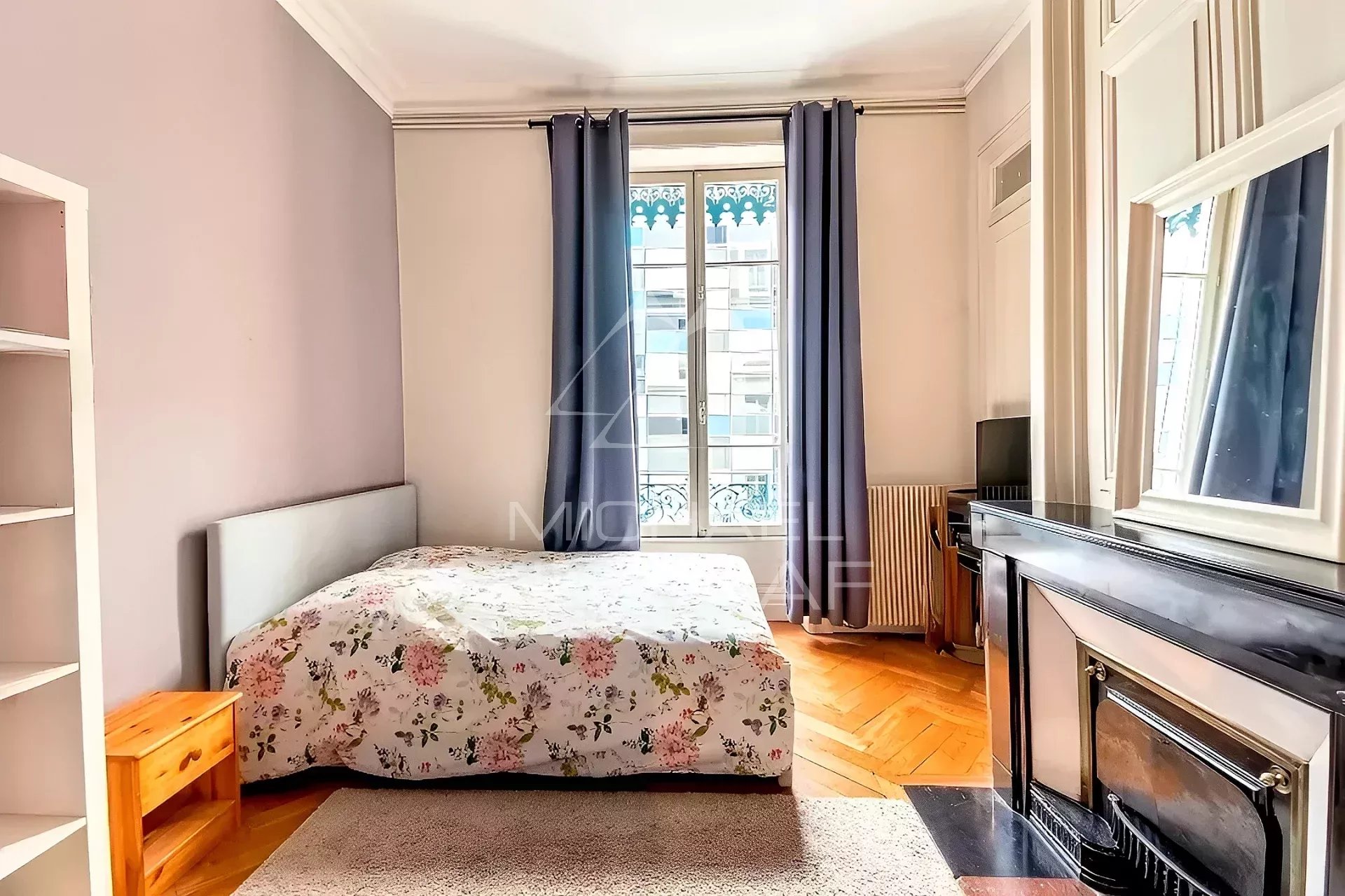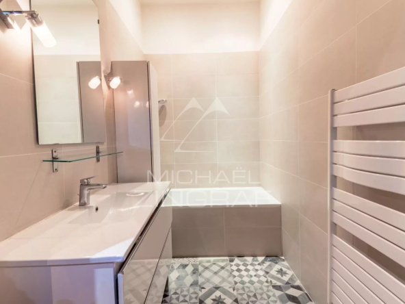 On accède à l’appartement par un spacieux hall d’entrée distribuant toutes les pièces de réception composées de deux grands salons orientés à l’ouest, plongeant sur le Rhône, tout en contemplant la basilique et d’une vaste salle à manger. Puis dans le prolongement du hall, se tient une cuisine indépendante entièrement équipée et donnant sur le sud.