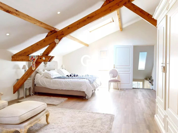 Elle développe de superbes volumes et conserve de magnifiques éléments d’époque, dont trois belles cheminées en pierre, de beaux parquets anciens, des hauteurs sous plafond généreuses.