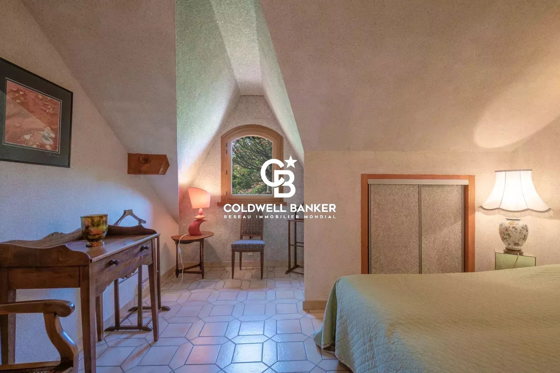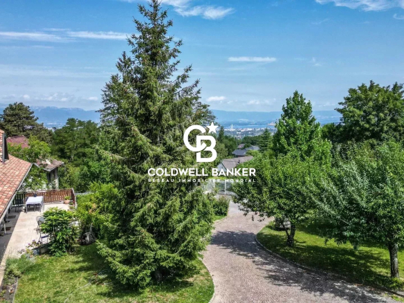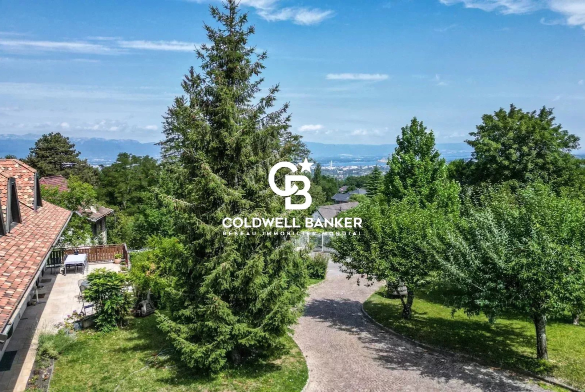A quelques pas de la frontière avec Genève, magnifique propriété des années 90. Terrain constructible de presque 4000 m2 joliment entretenu et arboré. Un emplacement rare sans vis à vis et au calme. Vue Lac Léman, Jet d’Eau et Salève. La maison totalise 366m2 habitables. Séjour avec cheminée et belles hauteurs sous plafond, cuisine séparée. 2 terrasses Est et Ouest. 6 chambres et 2 bureaux, 4 salles de bains. Au sous-sol, pièce de vie avec salle d’eau,/wc, pouvant être un studio indépendant, plusieurs caves, Carnotzet et 3 garages. Grande cour pour stationner plusieurs véhicules. Toiture récente. Chaudière gaz avec chauffage au sol.