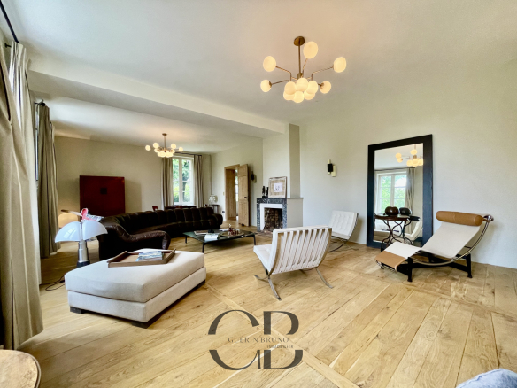 Au rez-de-chaussée, une vaste entrée mène à une salle à manger à droite et à un superbe espace salon à gauche, agrémenté d’une cheminée et d’un magnifique parquet. À l’extrémité de l’entrée, un couloir dessert une cuisine, un petit salon, un cellier, deux chambres avec salle d’eau, un bureau donnant sur un patio, ainsi qu’une suite parentale complète avec salle de bains, dressing et de nombreux rangements.