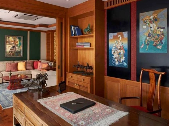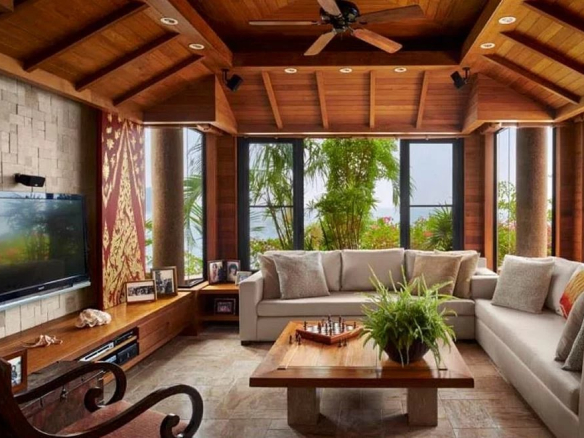 Le magnifique salon lambrissé de teck a des panneaux de bois peints sur mesure par un artiste thaïlandais qui bordent le hall d’entrée et la salle à manger en arrière-plan. Ce salon accueillant dispose de deux grands canapés en velours et de deux chaises latérales entourant une table basse en bois. Le délicieux arrière-plan tropical respire la paix et la tranquillité avec un jardin verdoyant et une mini cascade en pierre de granit déversant de l’eau dans la zone de l’étang d’orchidées d’entrée. Chaque coin du salon comporte également des étagères / armoires intégrées, comme on le voit à gauche de l’un des panneaux d’art.