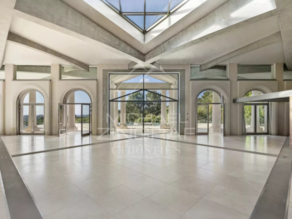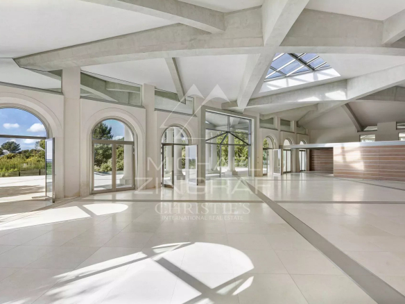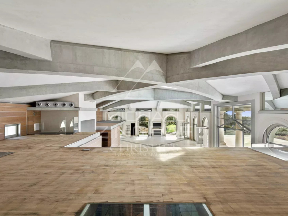 Le rez-de-chaussée, d’environ 480 m², se compose d’un vaste espace de réception baigné de lumière naturelle et ouvert sur une grande terrasse en pierre. Une mezzanine de plus de 100 m² surplombe le salon et peut être transformée en bureau, bibliothèque ou suite. Ce niveau inclut également une cuisine, un dressing, deux salles de bains et une salle de douche. L’ensemble s’ouvre sur la terrasse offrant une vue sur la mer et sur une piscine à débordement avec jacuzzi.