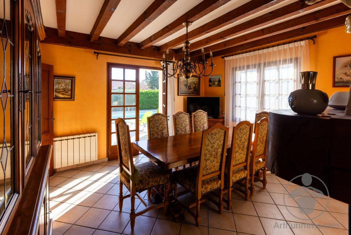 À l’extérieur, vous profiterez d’une piscine au sel, d’un local technique, d’un espace cuisine extérieur, d’un terrain de pétanque ainsi que d’un vaste garage permettant un important volume de rangement.