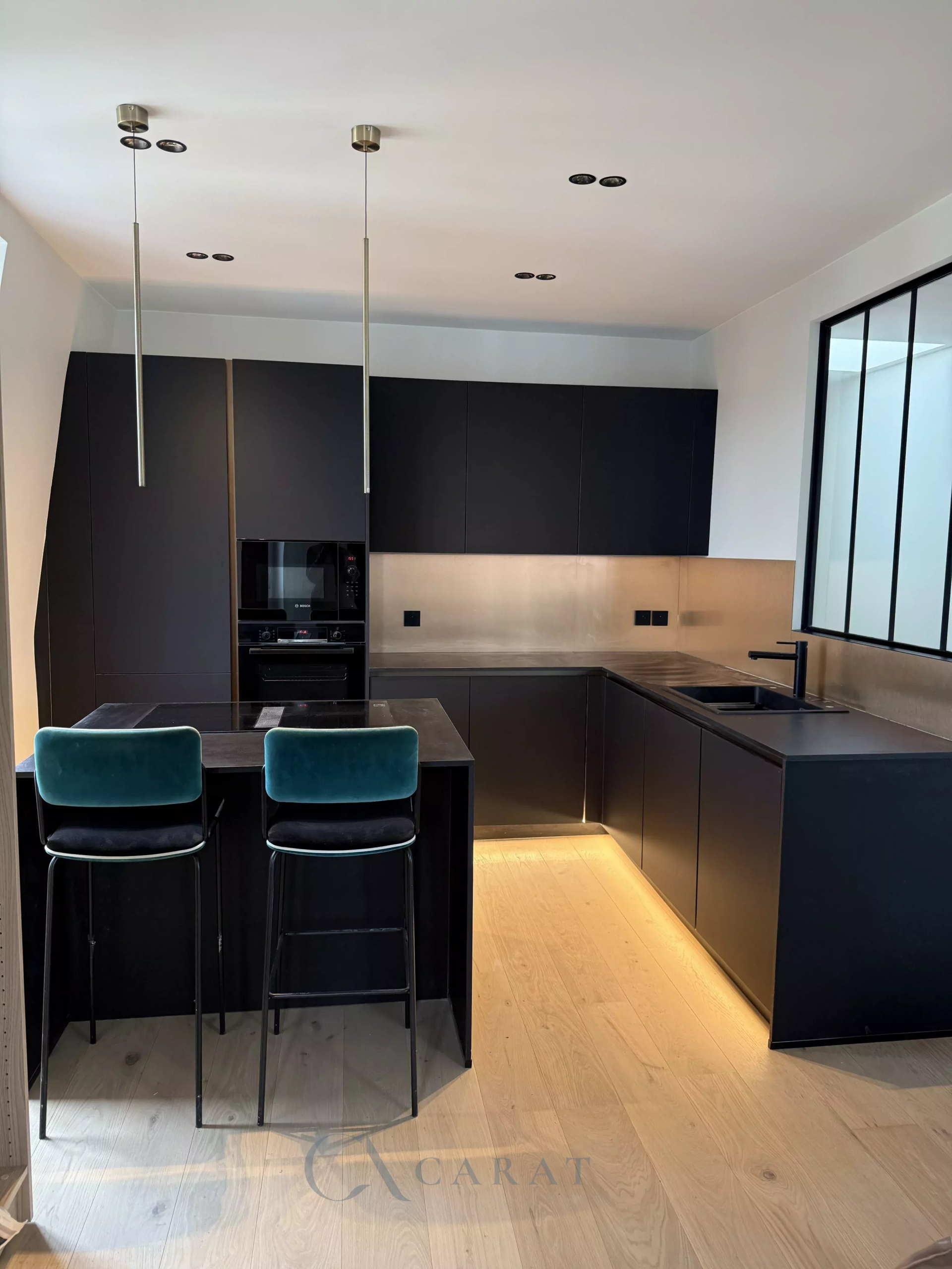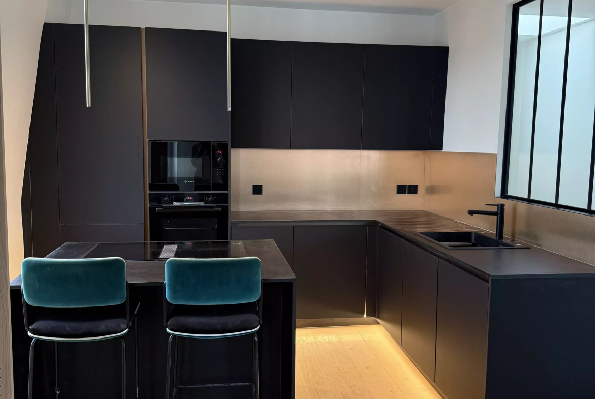Cuisine : Une cuisine américaine moderne, entièrement équipée avec des matériaux nobles, s’intégrant parfaitement à l’espace de vie.