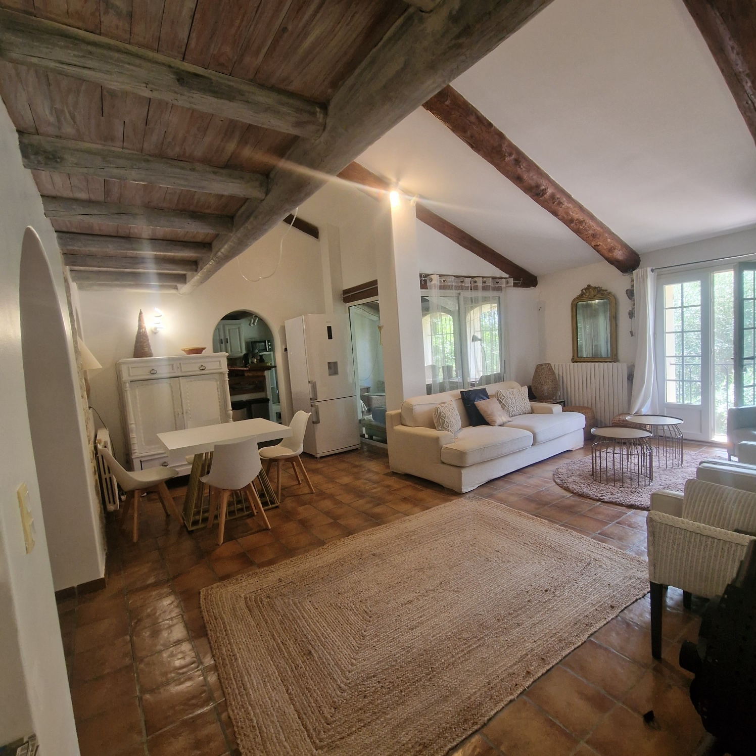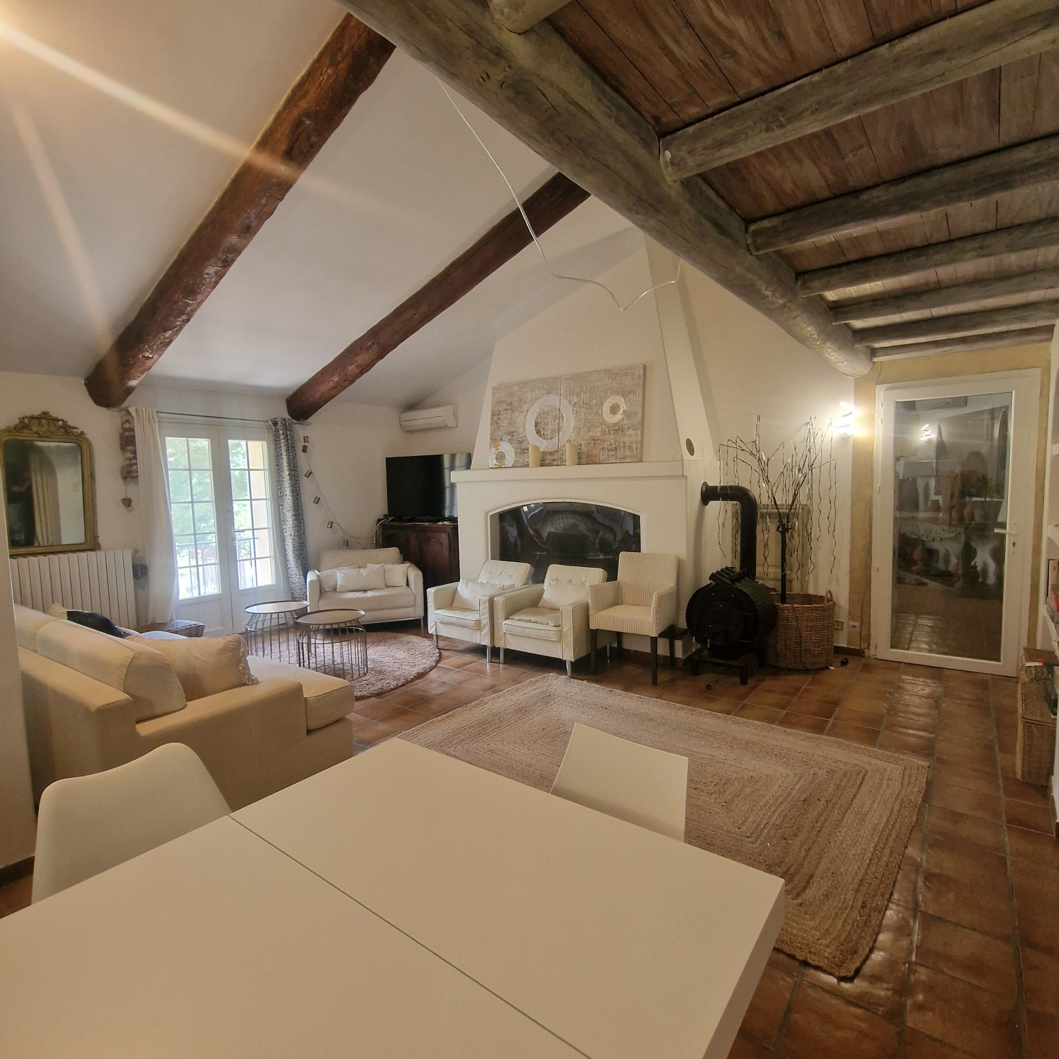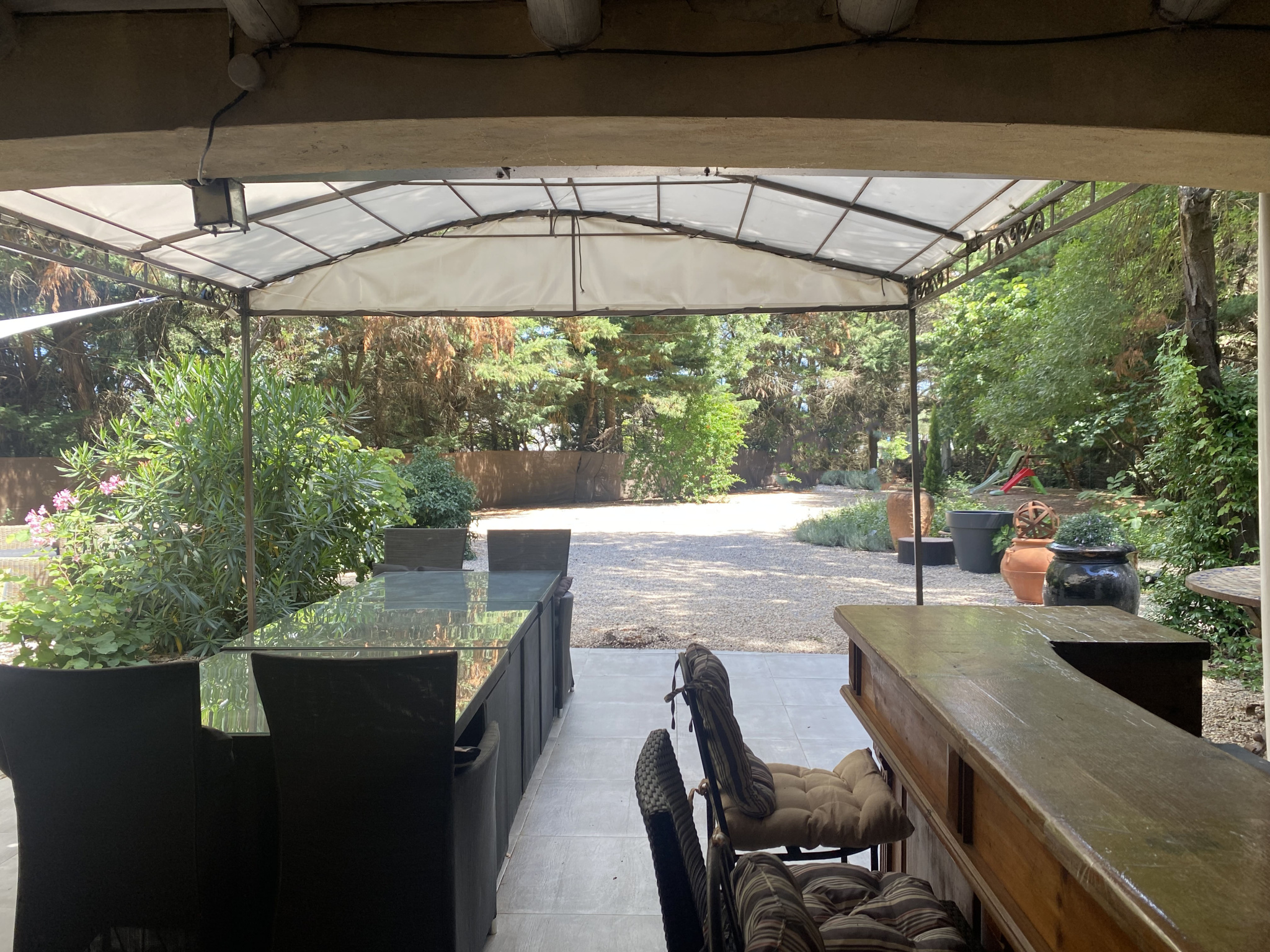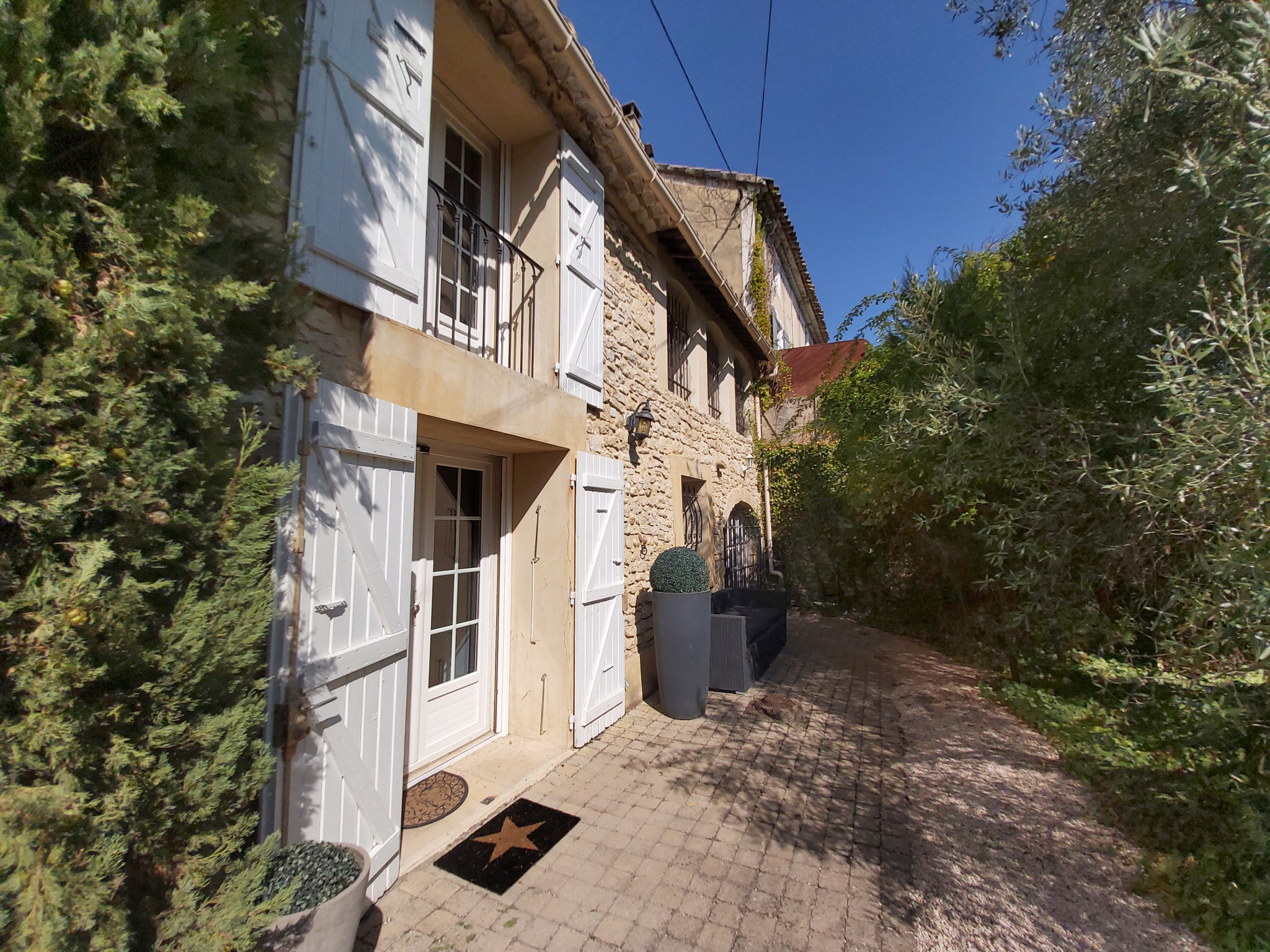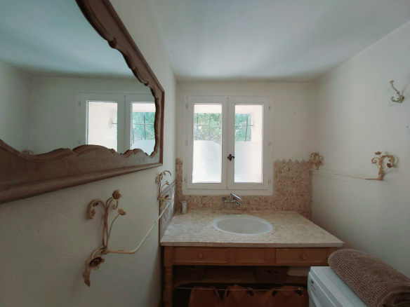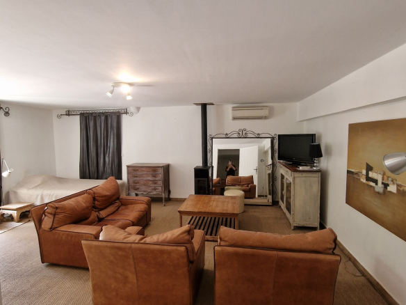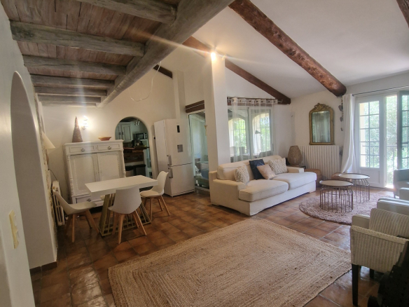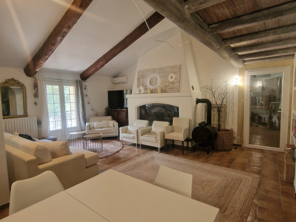 Le Mas est mitoyen, mais non gênant, pas de vis-à-vis. Il se compose d’un T2 indépendant loué 500 EUR/semaine, et pour la partie principale une possibilité de deux logements.