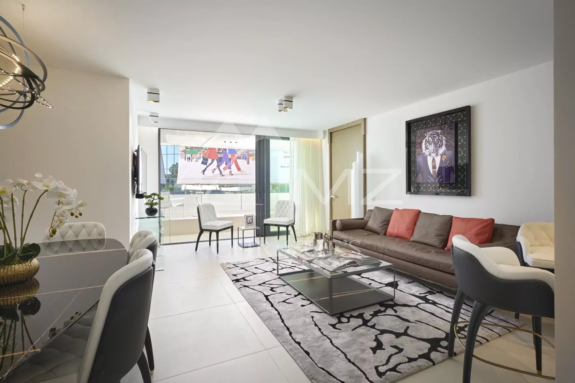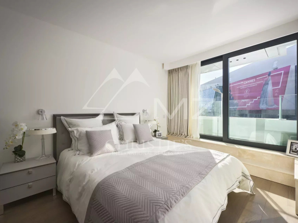 202 – Situé dans un immeuble neuf de la croisette, en face du palais des festivals, appartement de 94m² environ, comprenant : un séjour, une salle à manger, une cuisine équipée, une chambre en suite avec salle de douche et une chambre de maitre avec salle de bains/douche. Service conciergerie sur place. Idéal congrès et vacances.