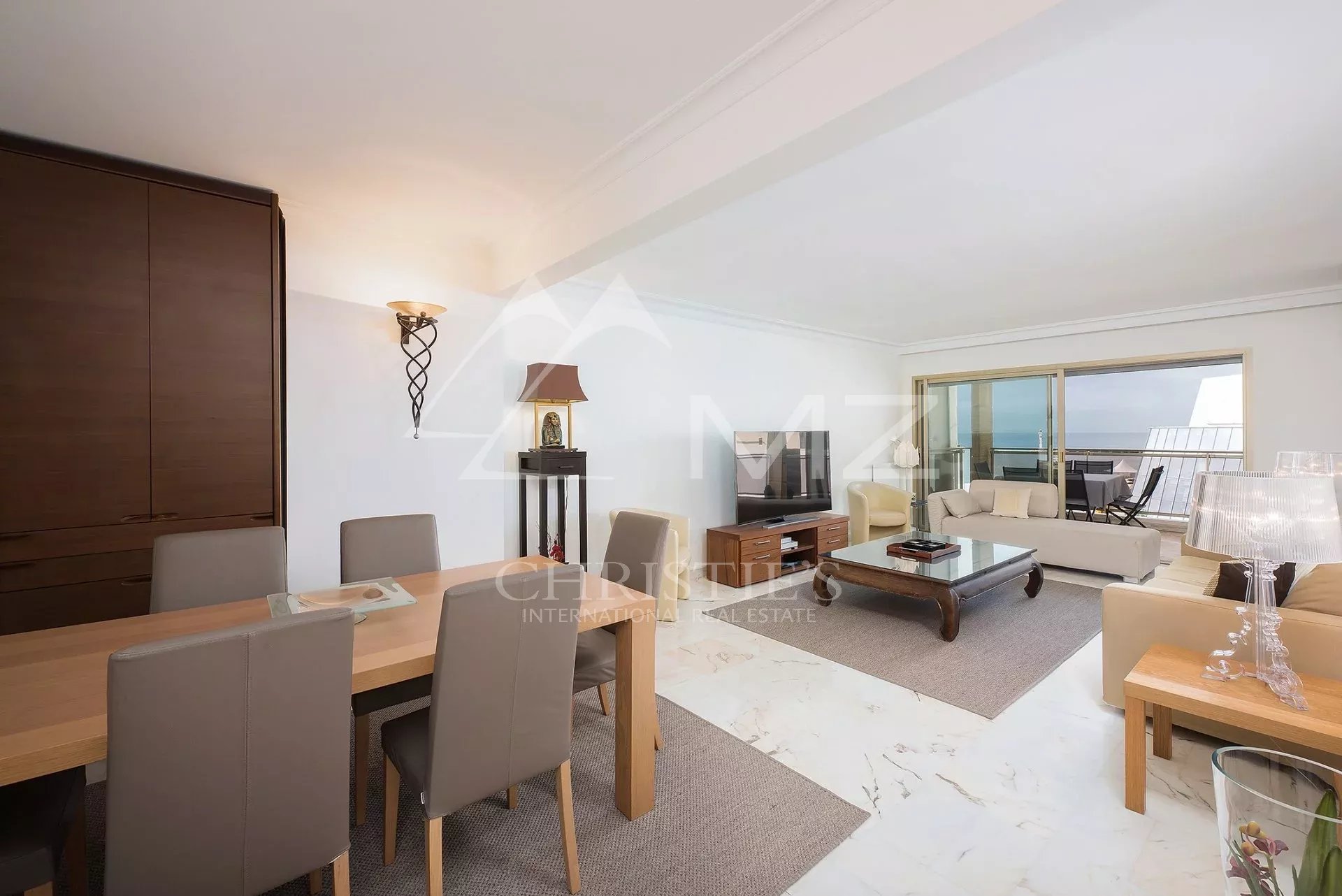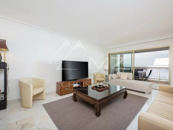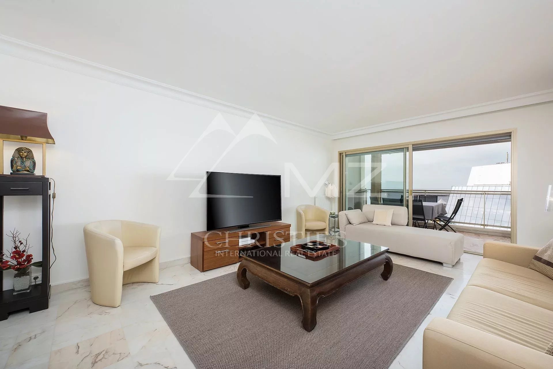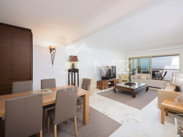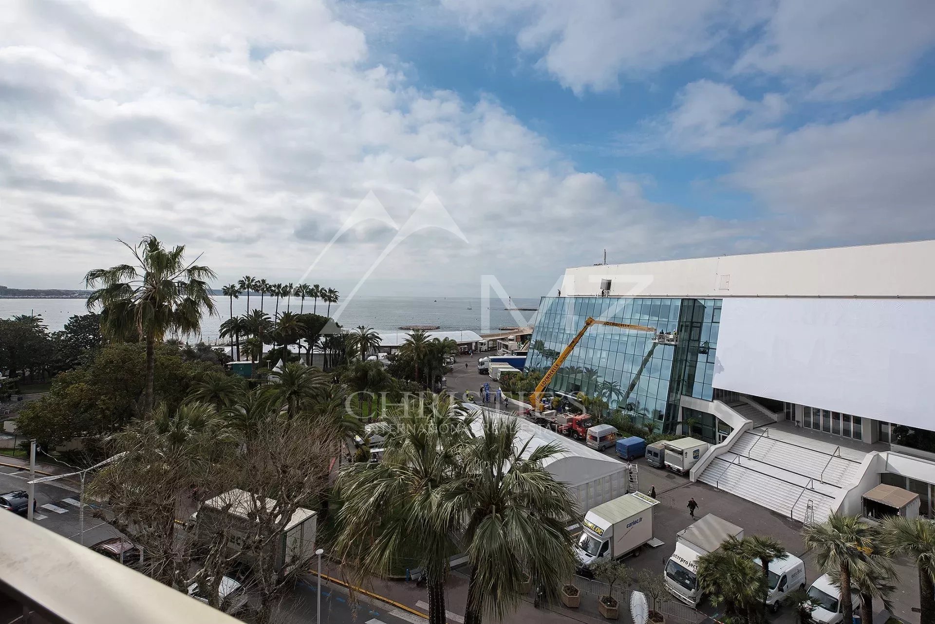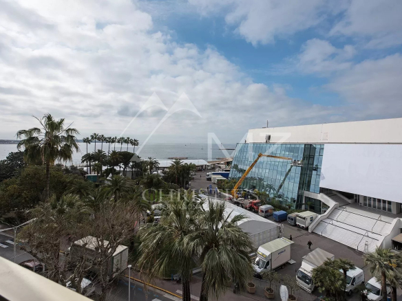 Idéalement situé en face du Palais des festivals, appartement de 110 m² environ avec vue mer et double terrasse, comprenant : un séjour avec accès terrasse, une cuisine équipée, deux chambres avec salles d’eau, une chambre avec salle de bains et une buanderie. Garage disponible. Prestations de qualité.