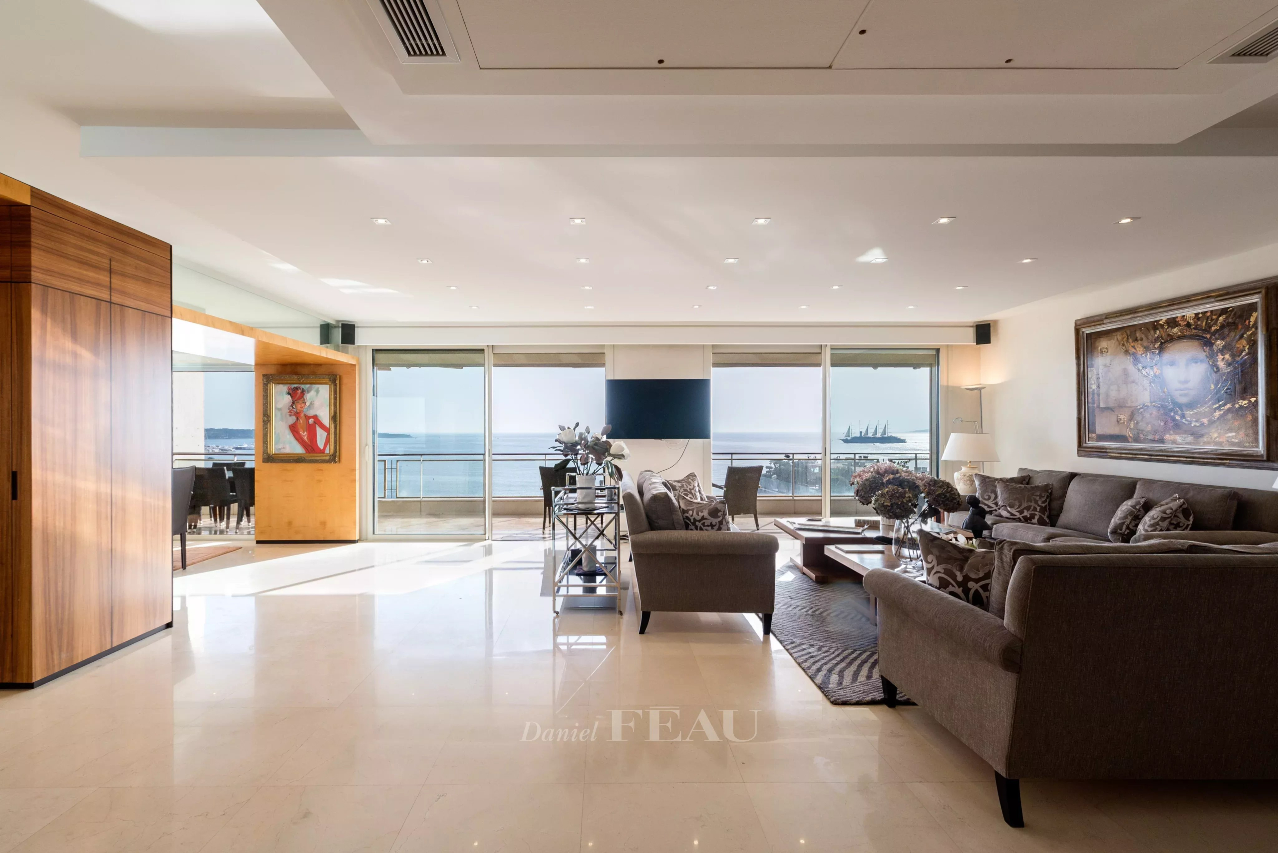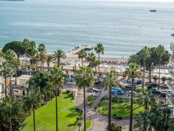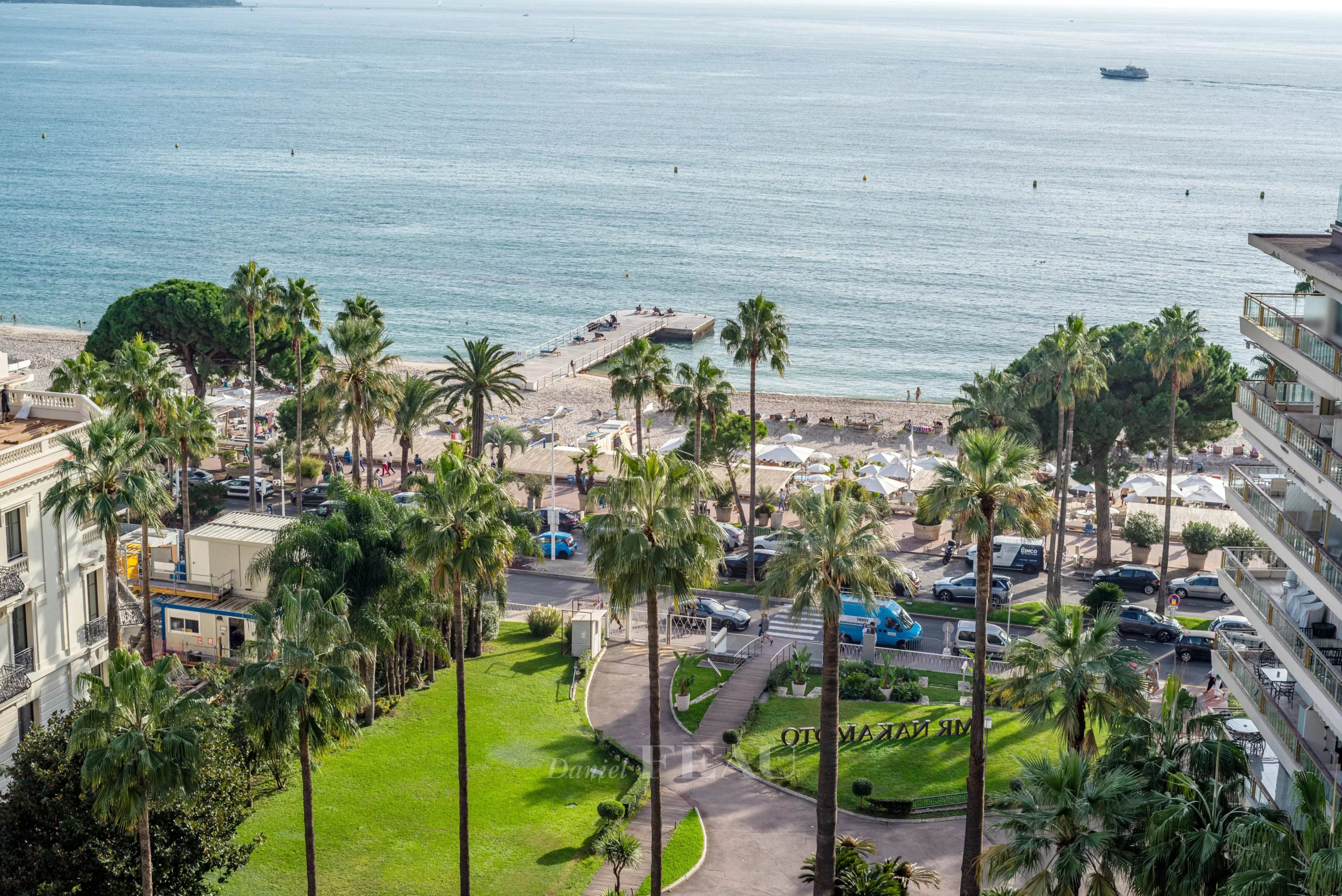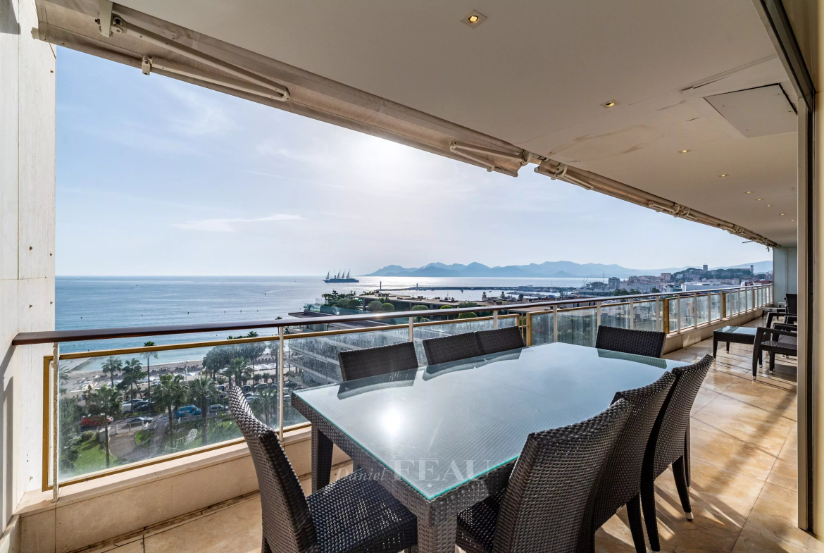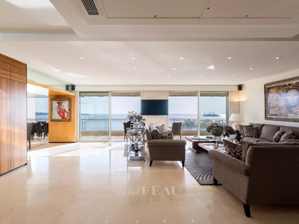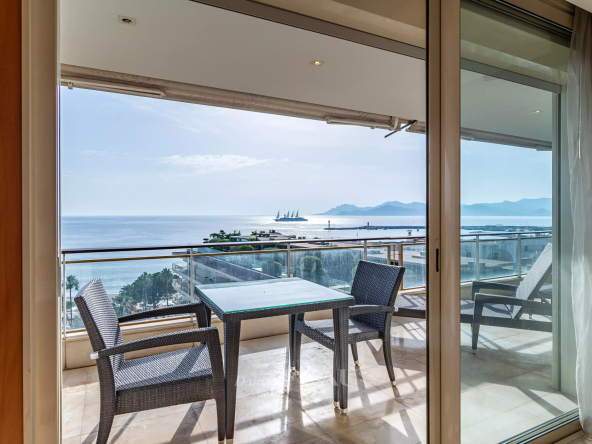 Coeur Croisette, à deux pas du Palais des Festivals, exclusif appartement situé au 10ème étage dans une résidence de renom offrant une vue mer panoramique sur la mer Méditerranée.