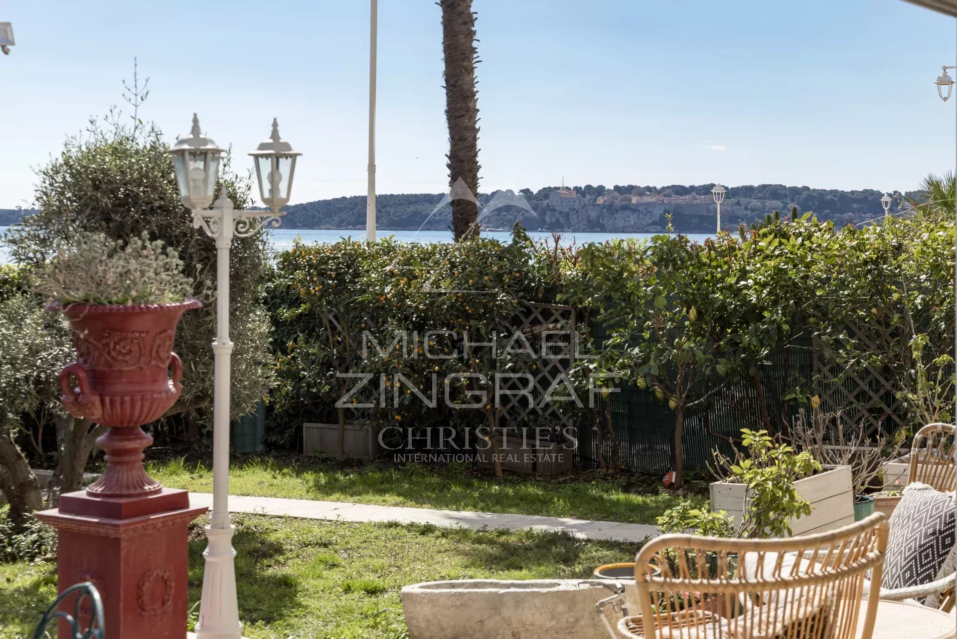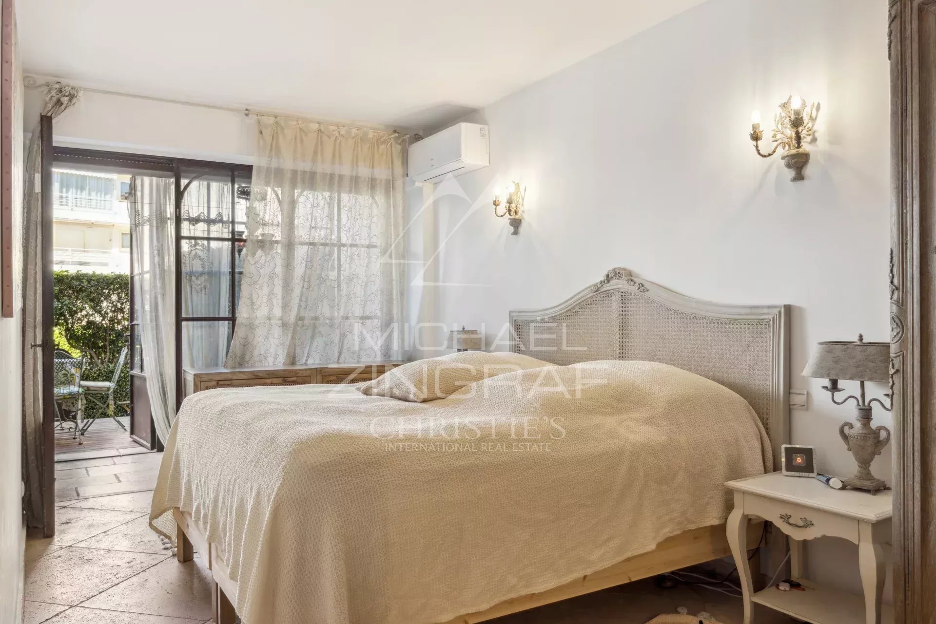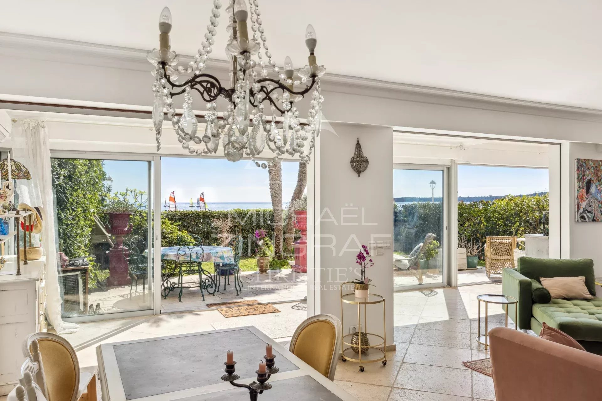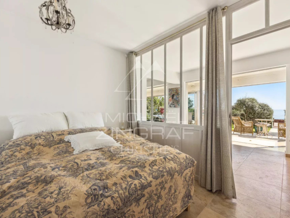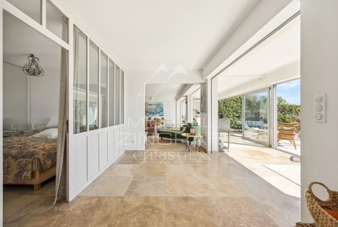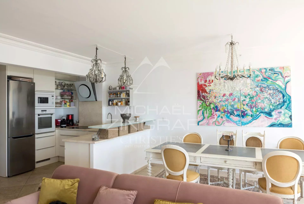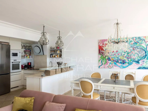 À l’extérieur, deux terrasses et un jardin d’environ 150 m² vous permettent de profiter pleinement du climat méditerranéen, apportant une atmosphère de maison à cet appartement. Imaginez-vous savourant un café le matin ou un apéritif en soirée, tout en admirant la vue imprenable sur la mer et sur les îles de Lérins.