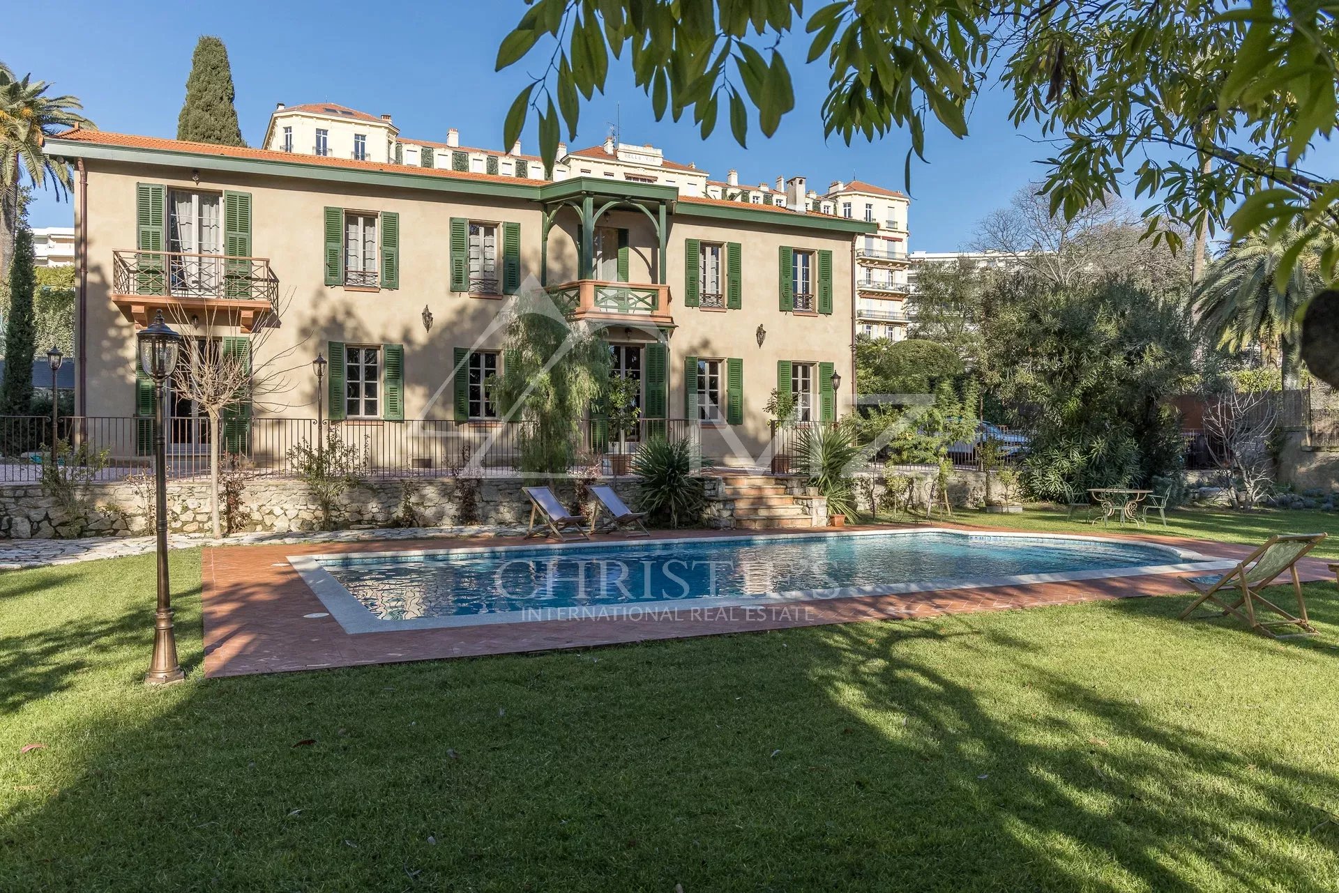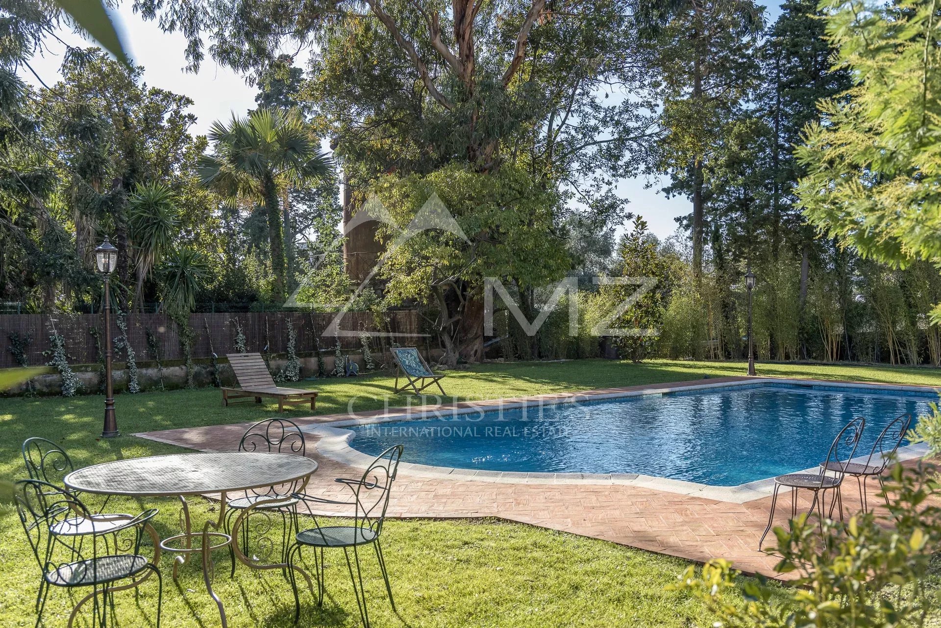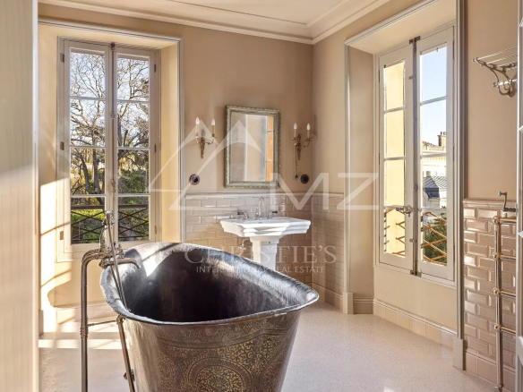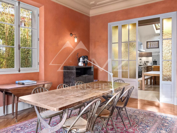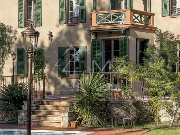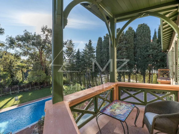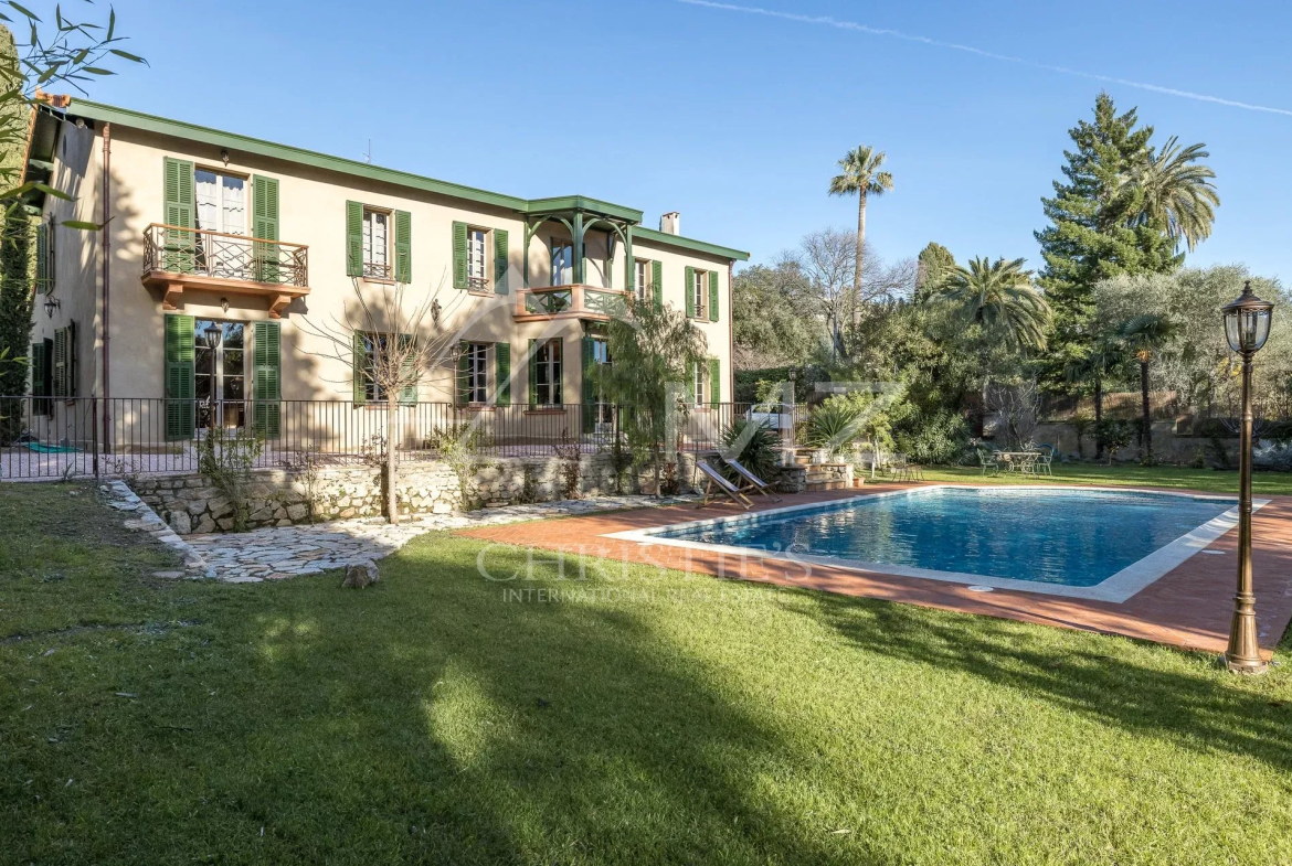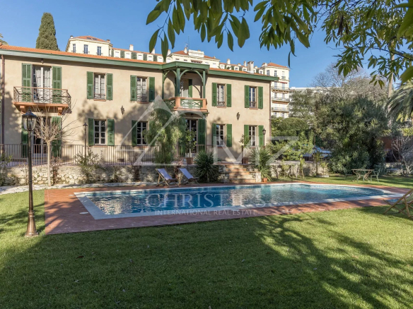 Demeure de charme située au calme de 400m² environ, proche de la mer et du palais des festivals, comprenant : Un salon, une salle de sport, une salle à manger et une cuisine. A l’étage, quatre chambres en suite avec quatre salle de bains. Grand parc arboré de 1500m², piscine 12×6.