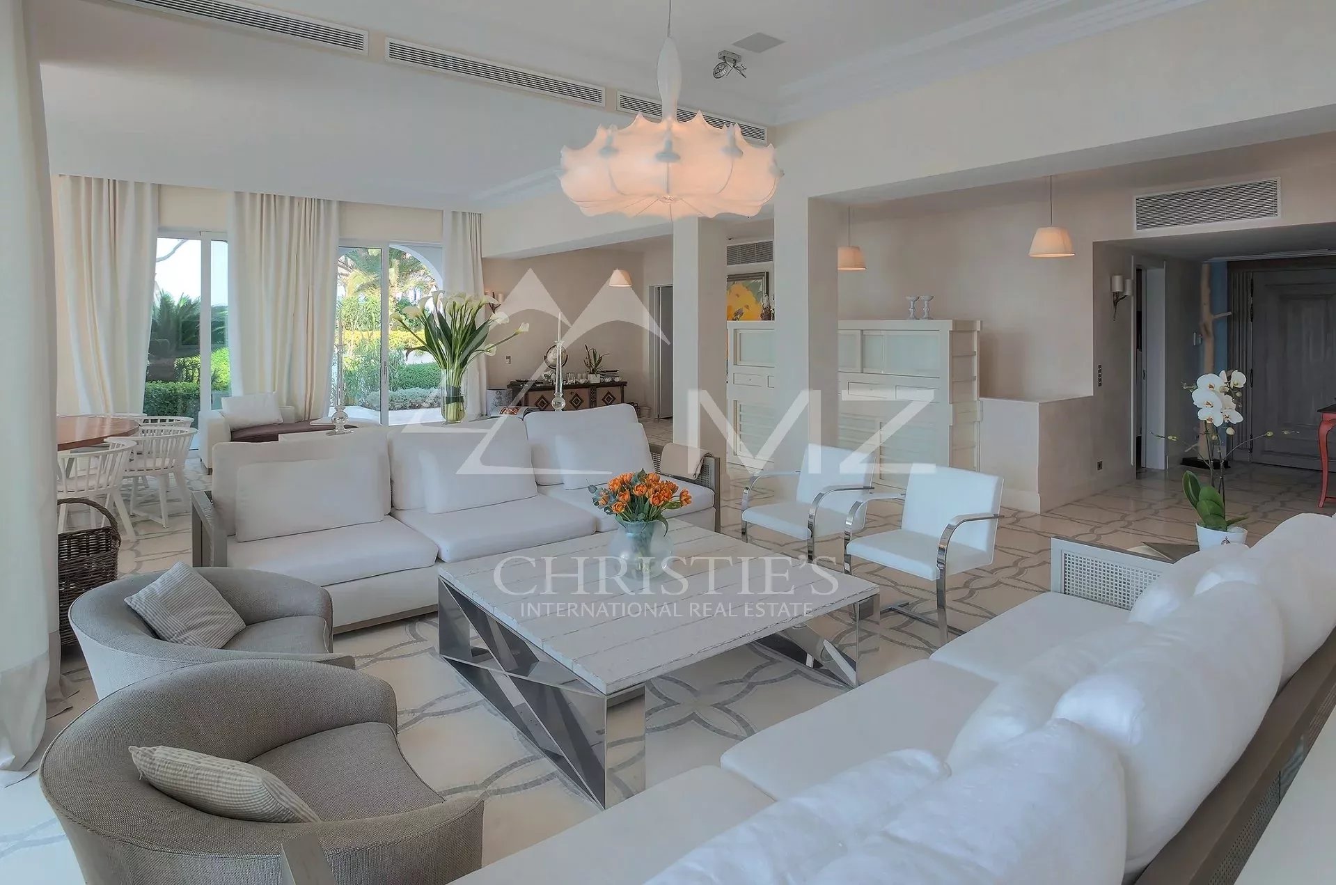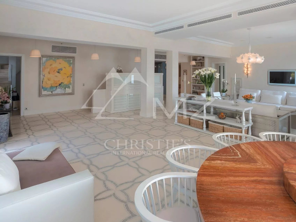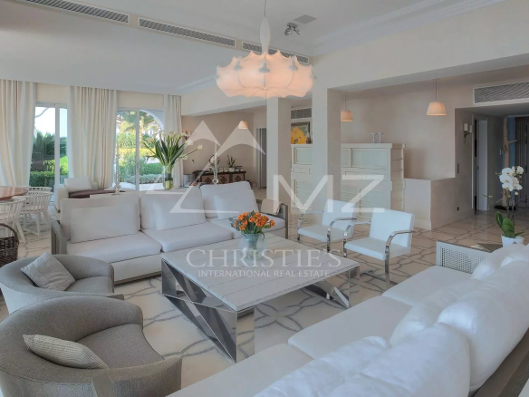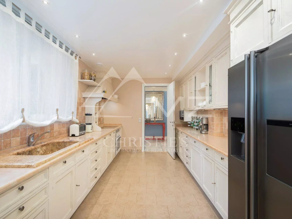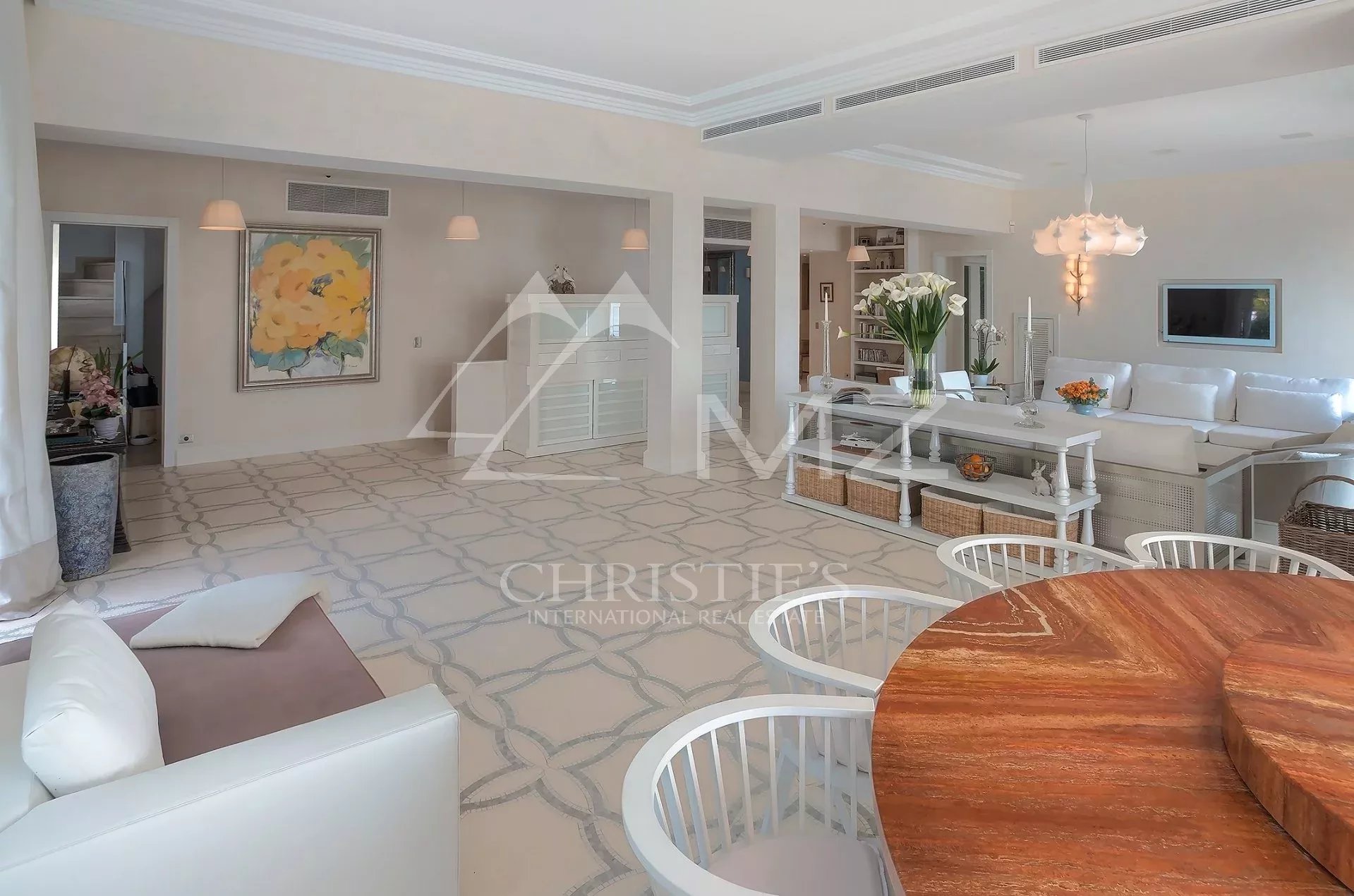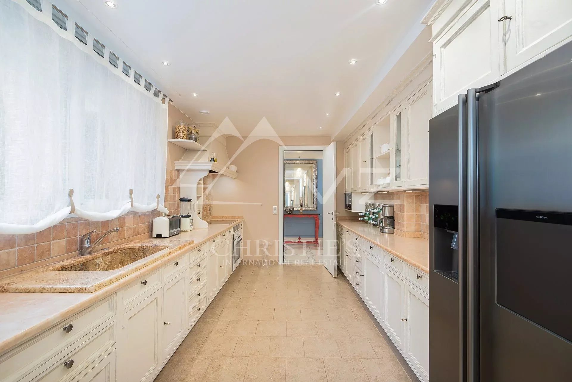 Au rez-de-jardin, une chambre avec salle de bain et dressing, deux chambres avec salle d’eau. Un appartement de gardien/staff comprenant un salon avec cuisine, deux chambres, une salle de bain, une salle d’eau, une buanderie, le tout avec accès indépendant. Piscine chauffée 12×5, salon d’hiver, parking 3 places, garage. Terrain de 1651 m². Accès privé mer.