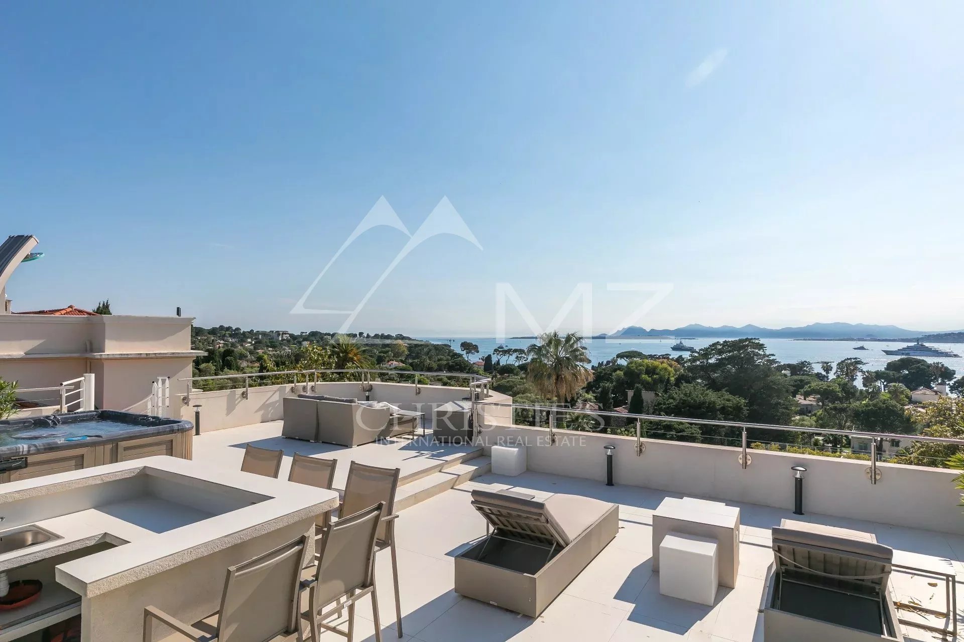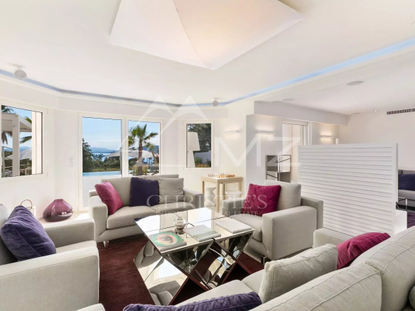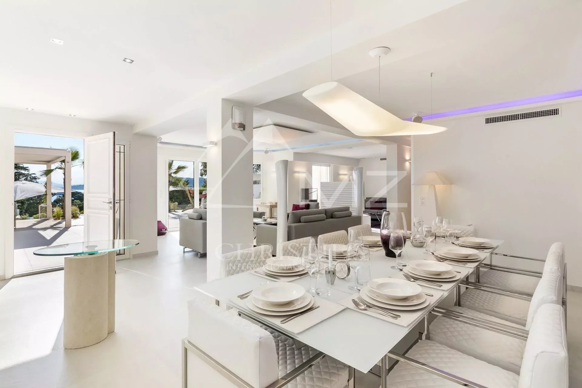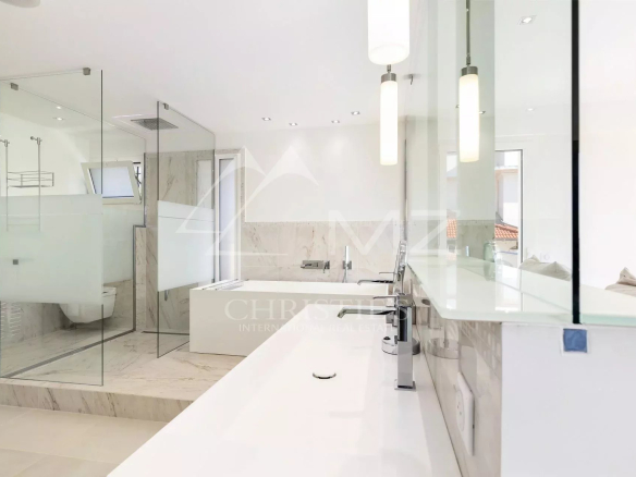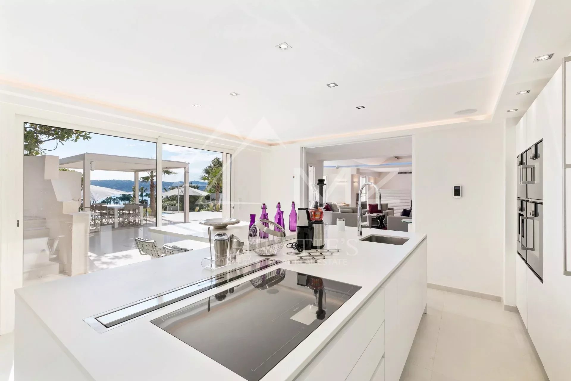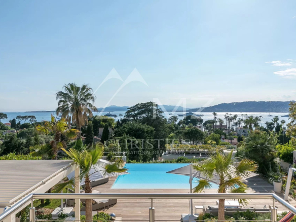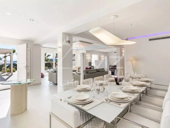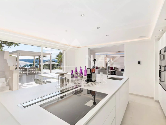 Somptueuse villa moderne d’environ 420 m² avec vue mer, comprenant au rez-de-chaussée : un séjour avec salle à manger, une cuisine équipée, une chambre en suite avec salle d’eau. A l’étage : une chambre de maître avec salle de bains, deux chambres en suite avec salle d’eau. Sur le toit, une terrasse avec bar et jacuzzi. Dans une maison d’ami, un séjour, une salle à manger, une cuisine, deux chambres en suite avec salle d’eau et une salle de sport. Terrain d’environ 1000m², piscine chauffée 10×10.